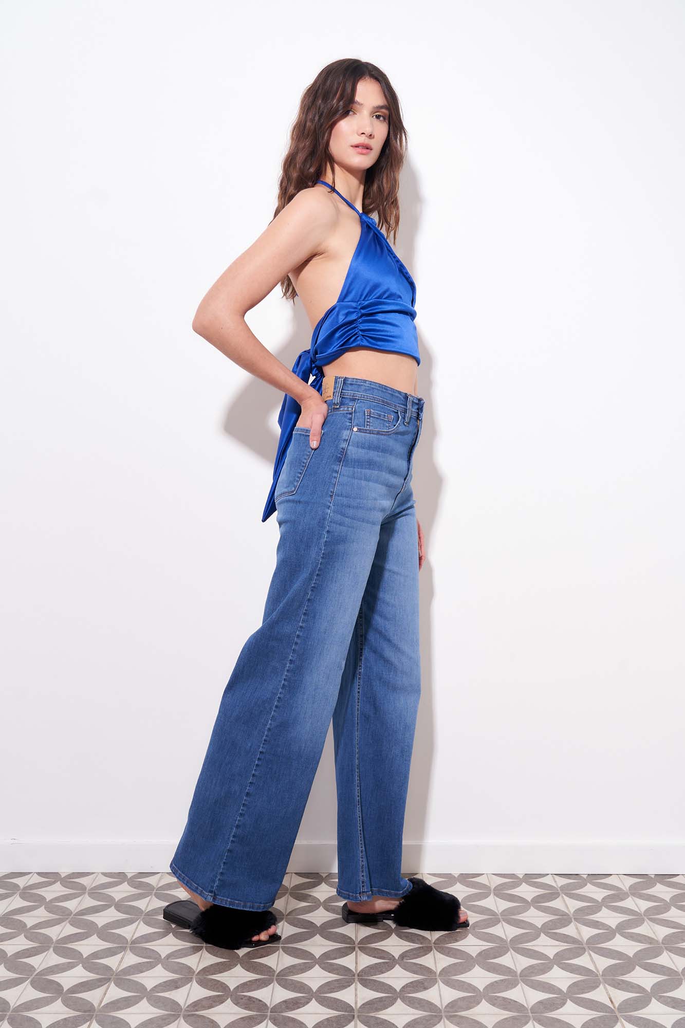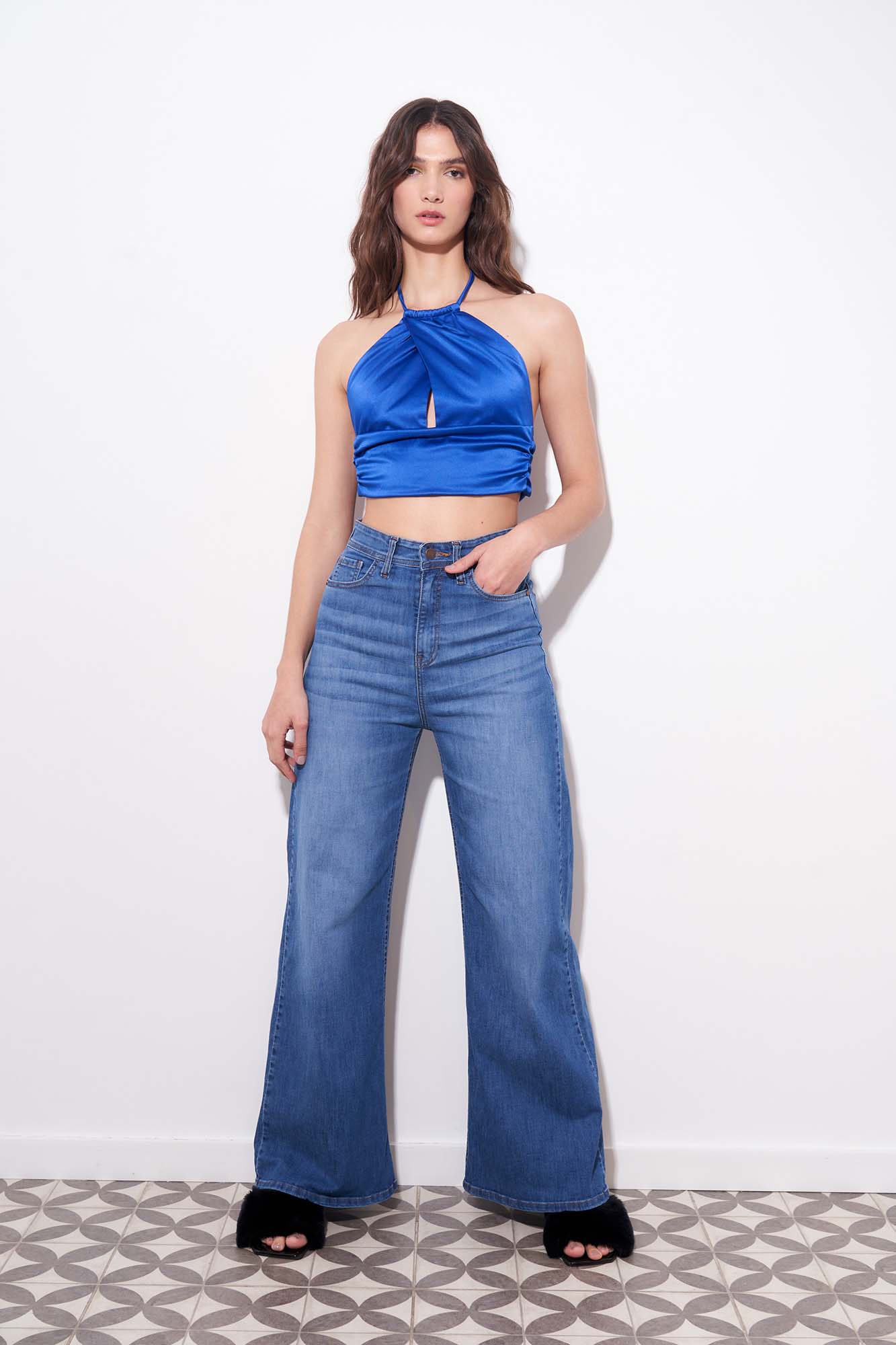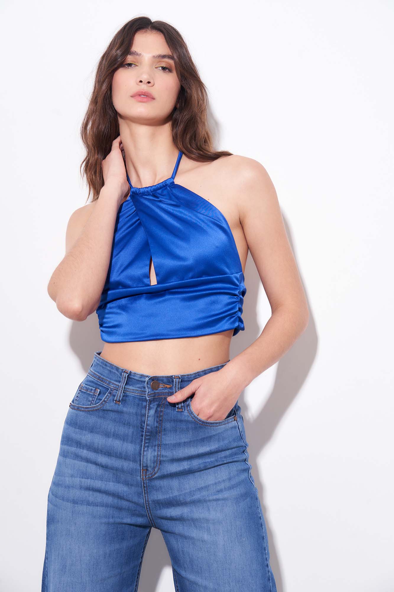 Top cruzado de raso escote halter con tiras para atar en espalda.