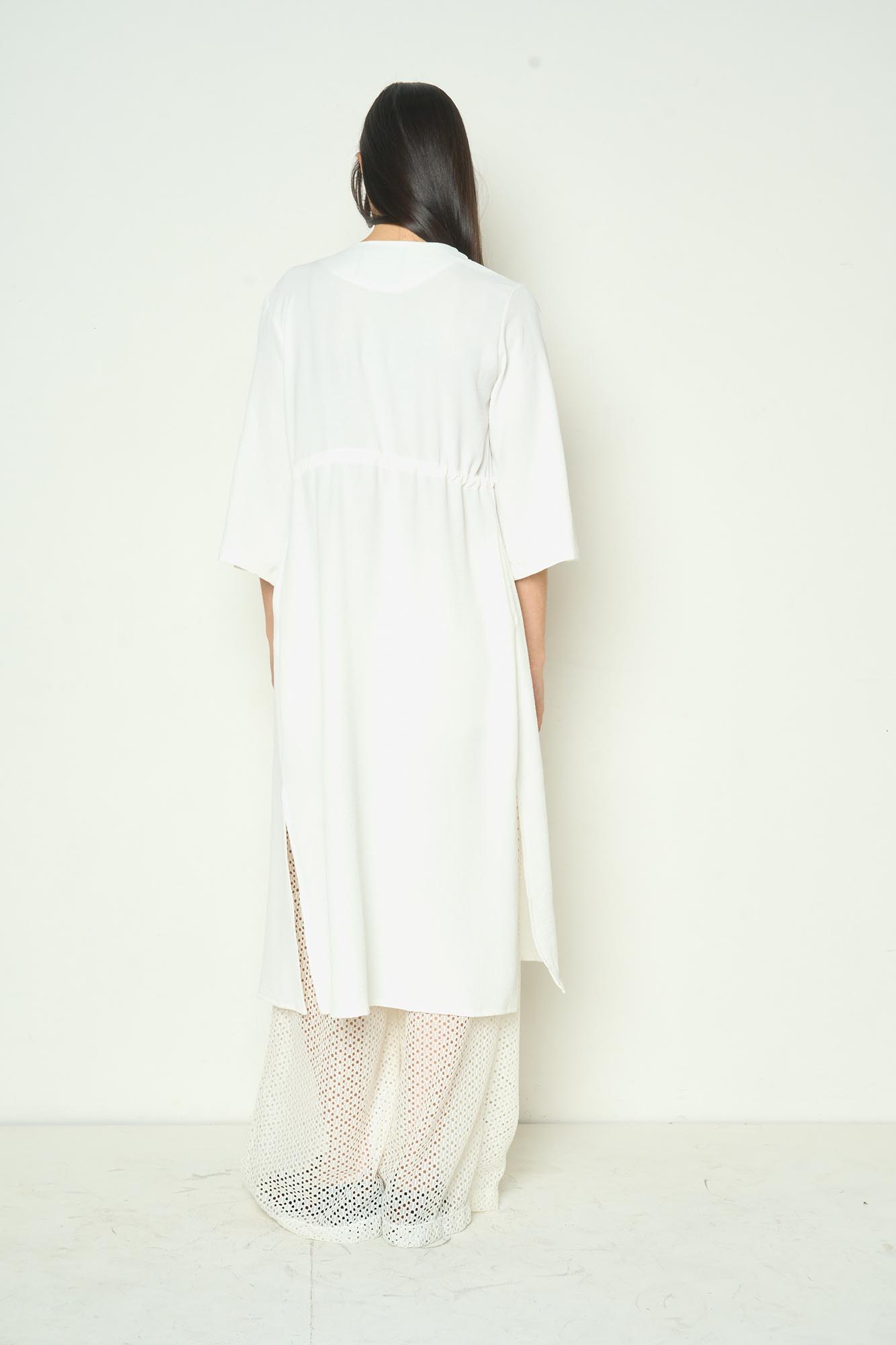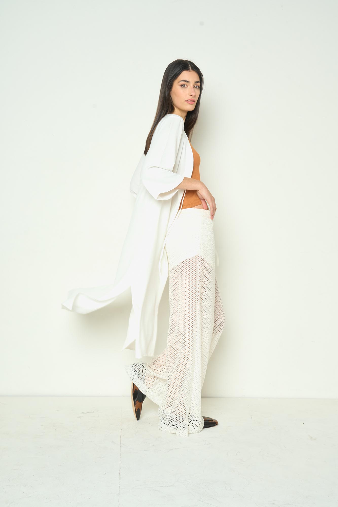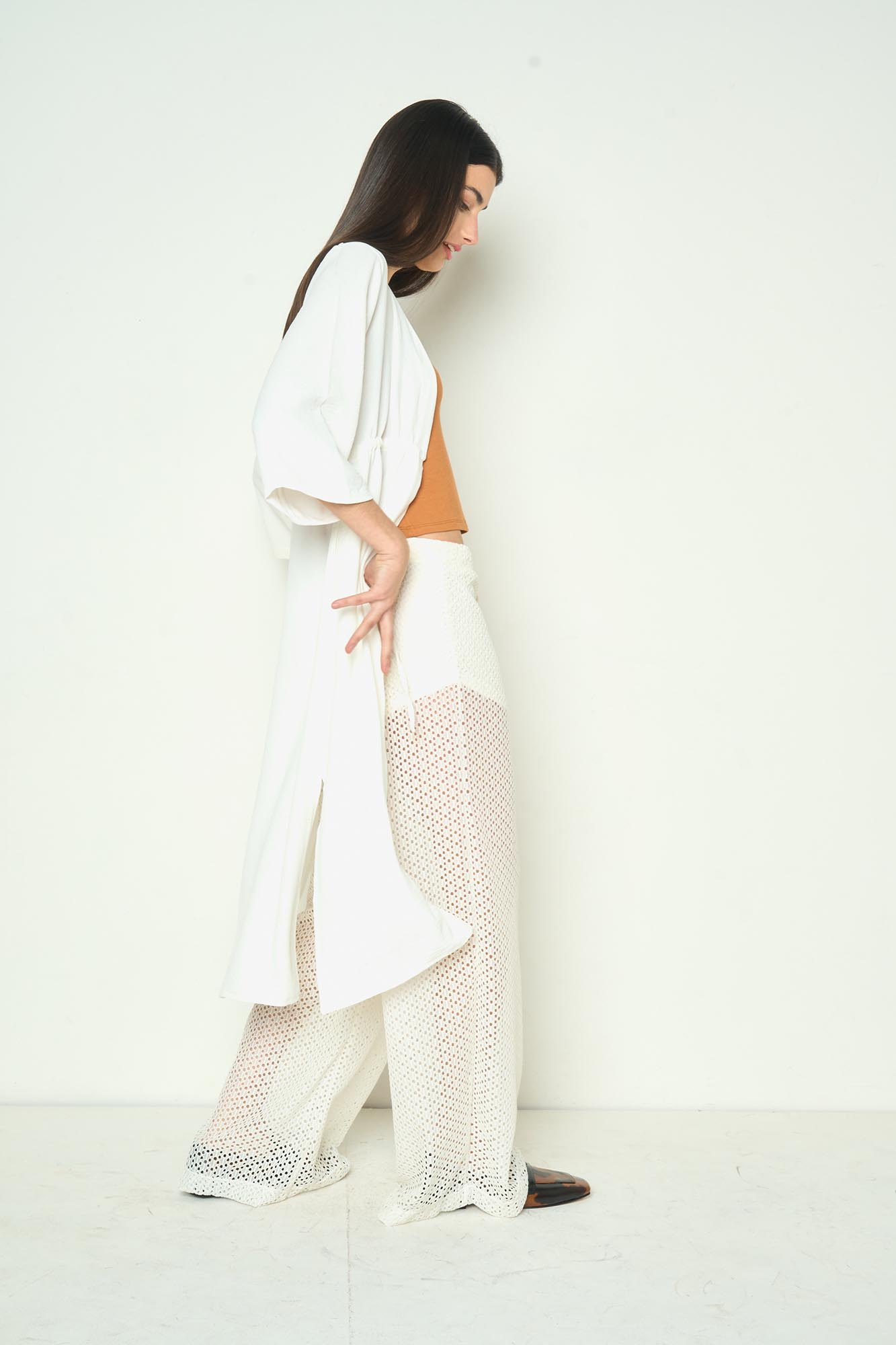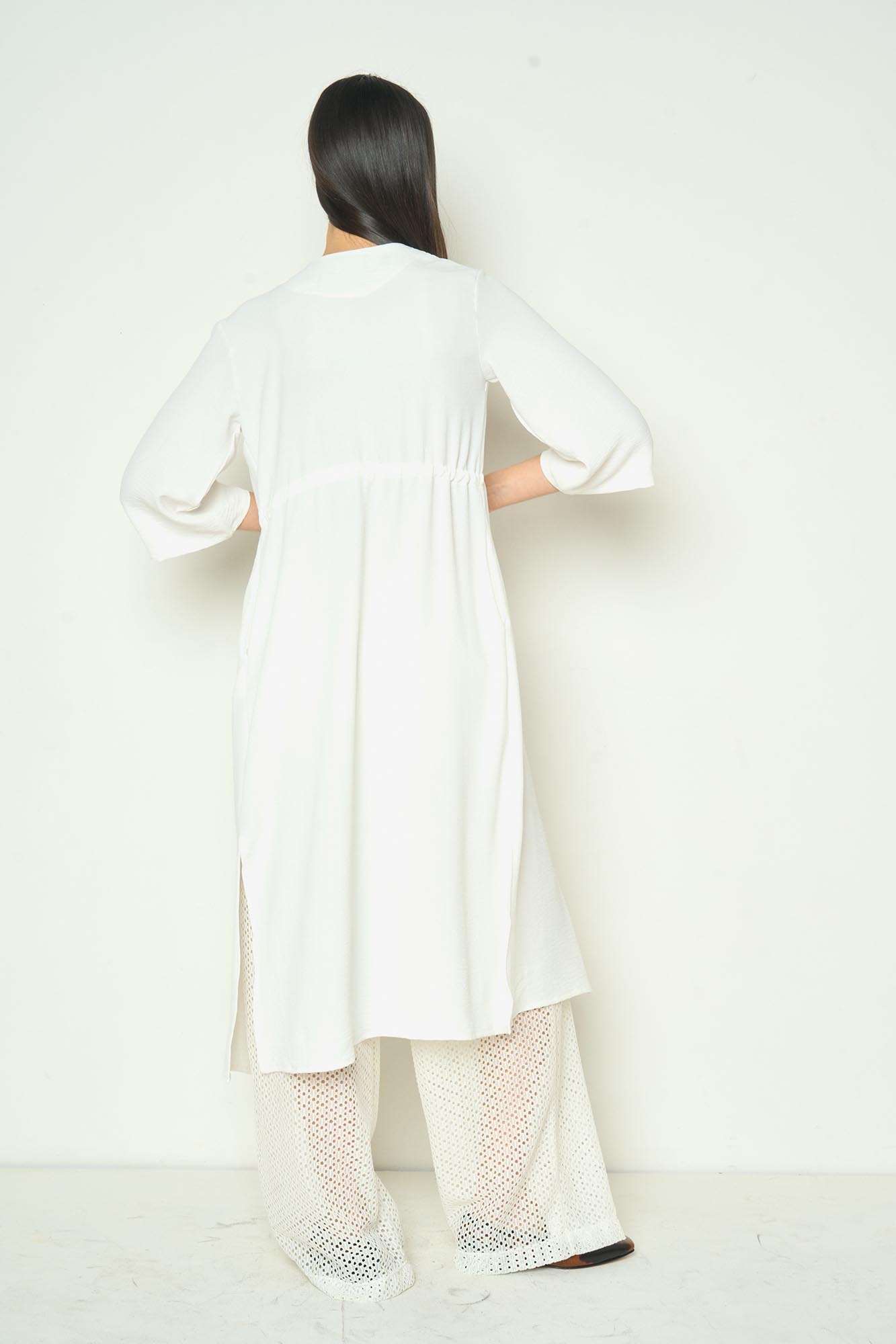 Kimono con jareta debajo del busto. Escote V y mangas tipo campana largo al codo. Se puede usar en set con el Pantalón Cosmopolitan