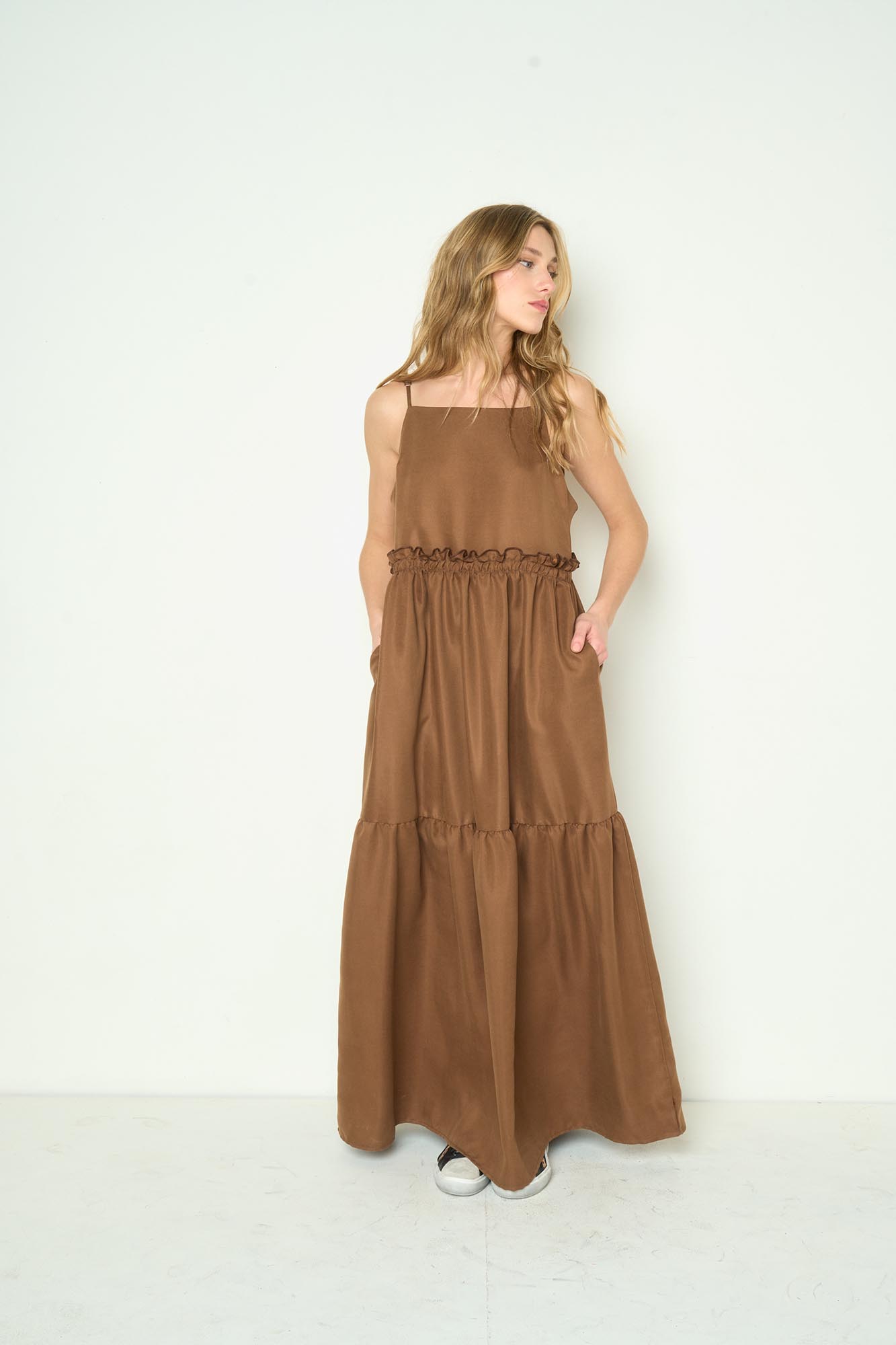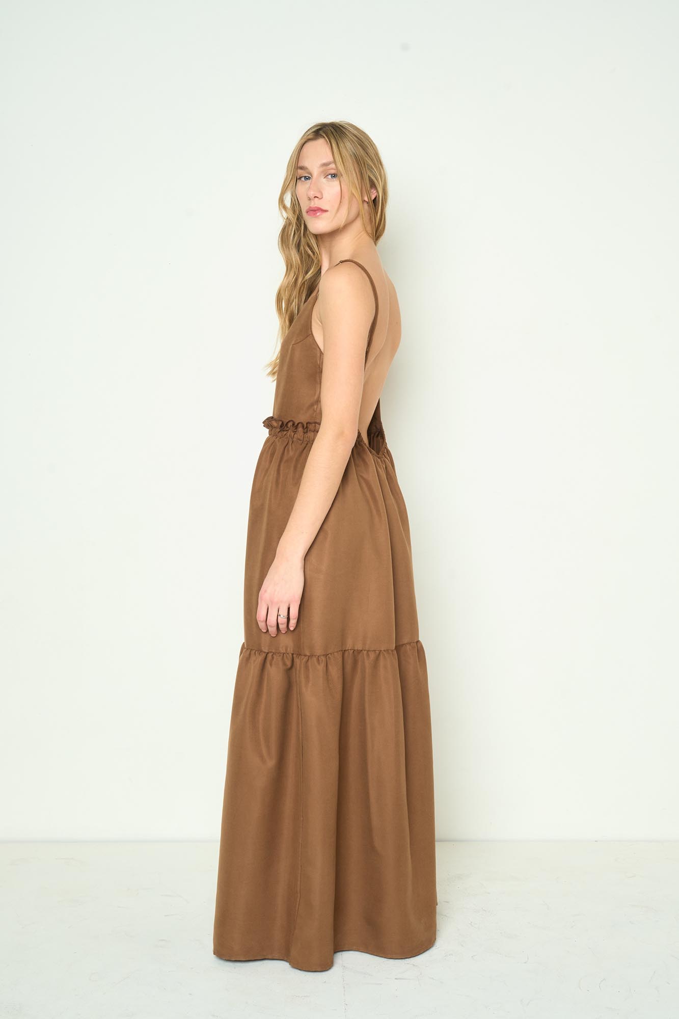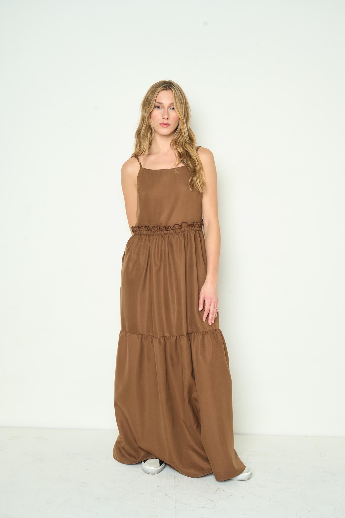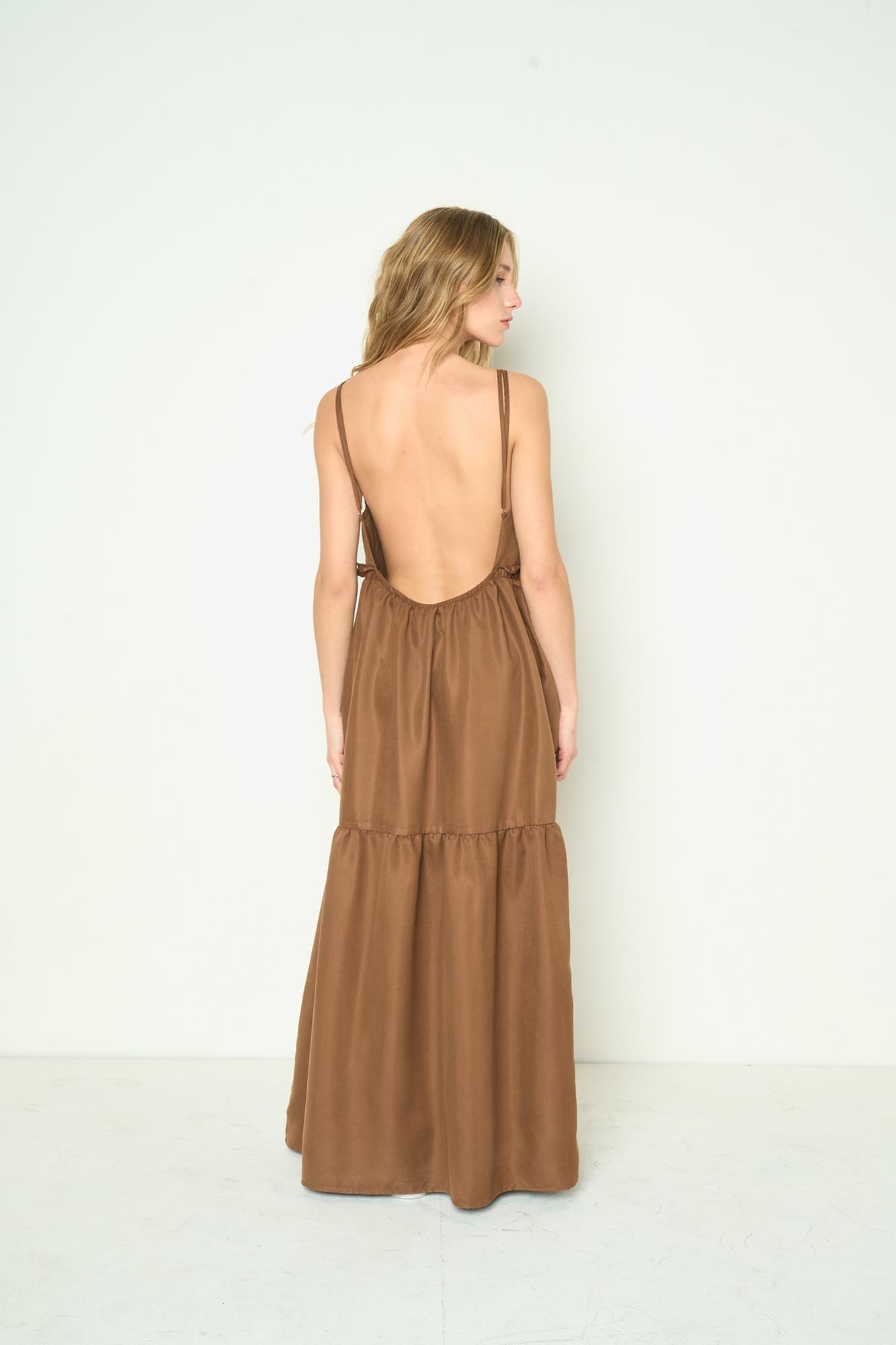 Vestido largo, con falda amplia en capas breteles regulables y espalda descubierta con elastico interno para mejorar el calce.