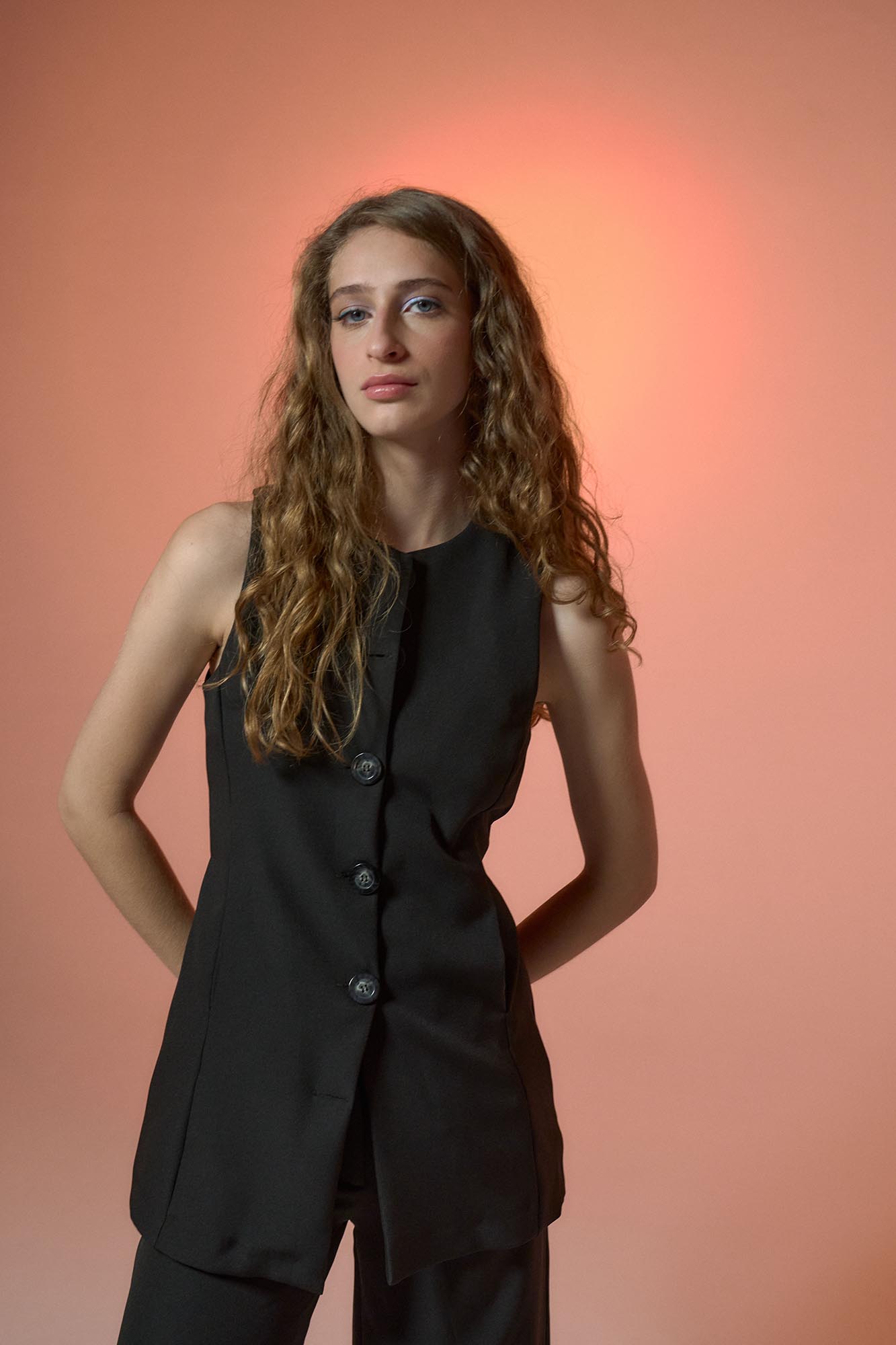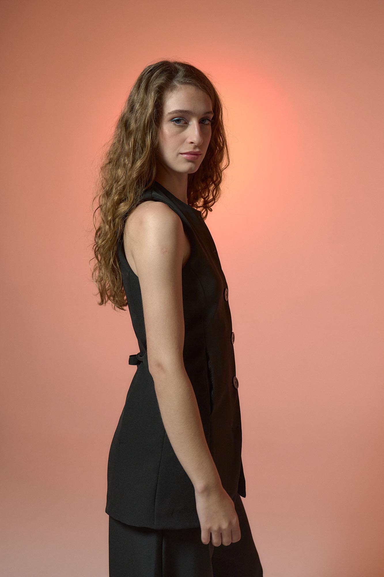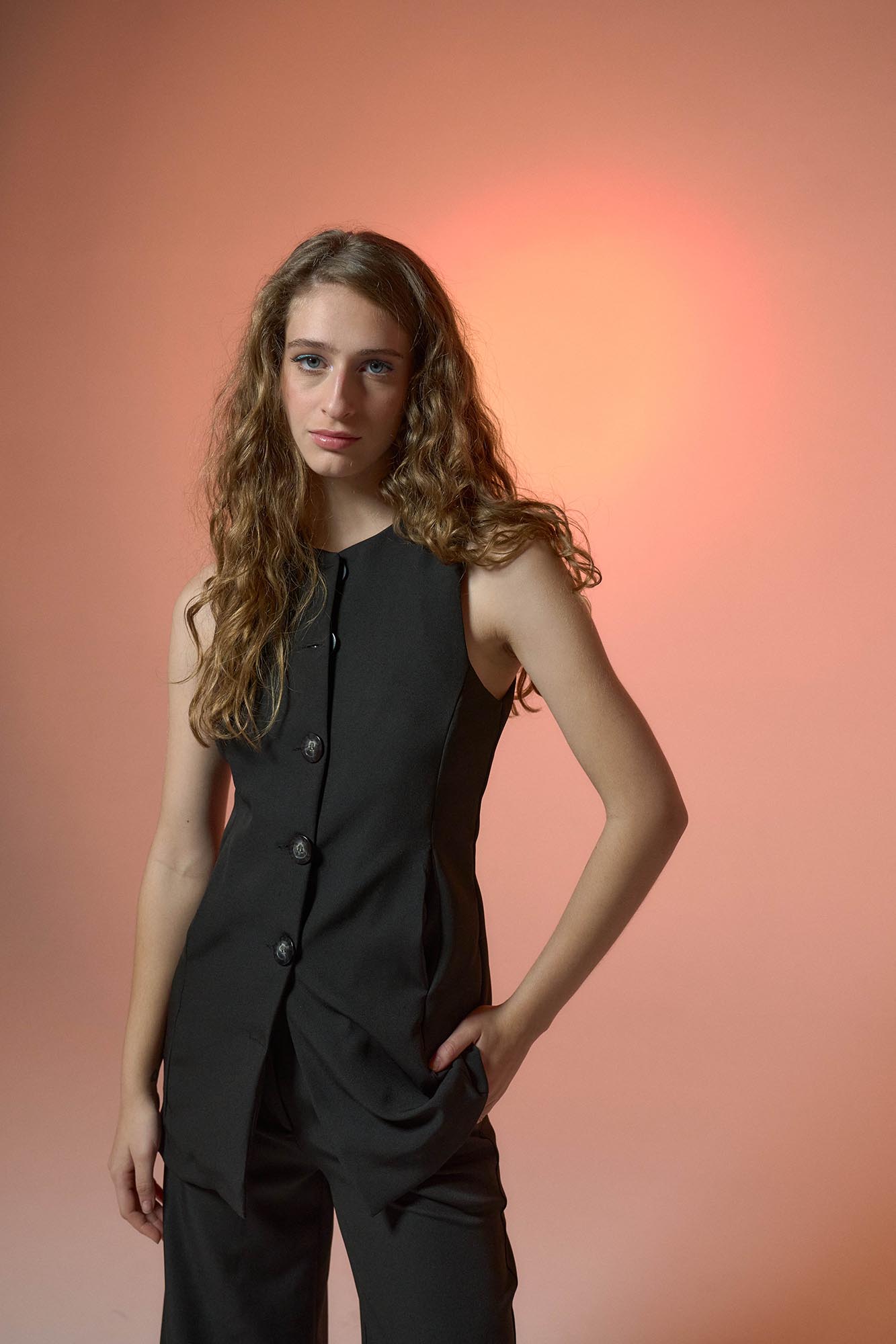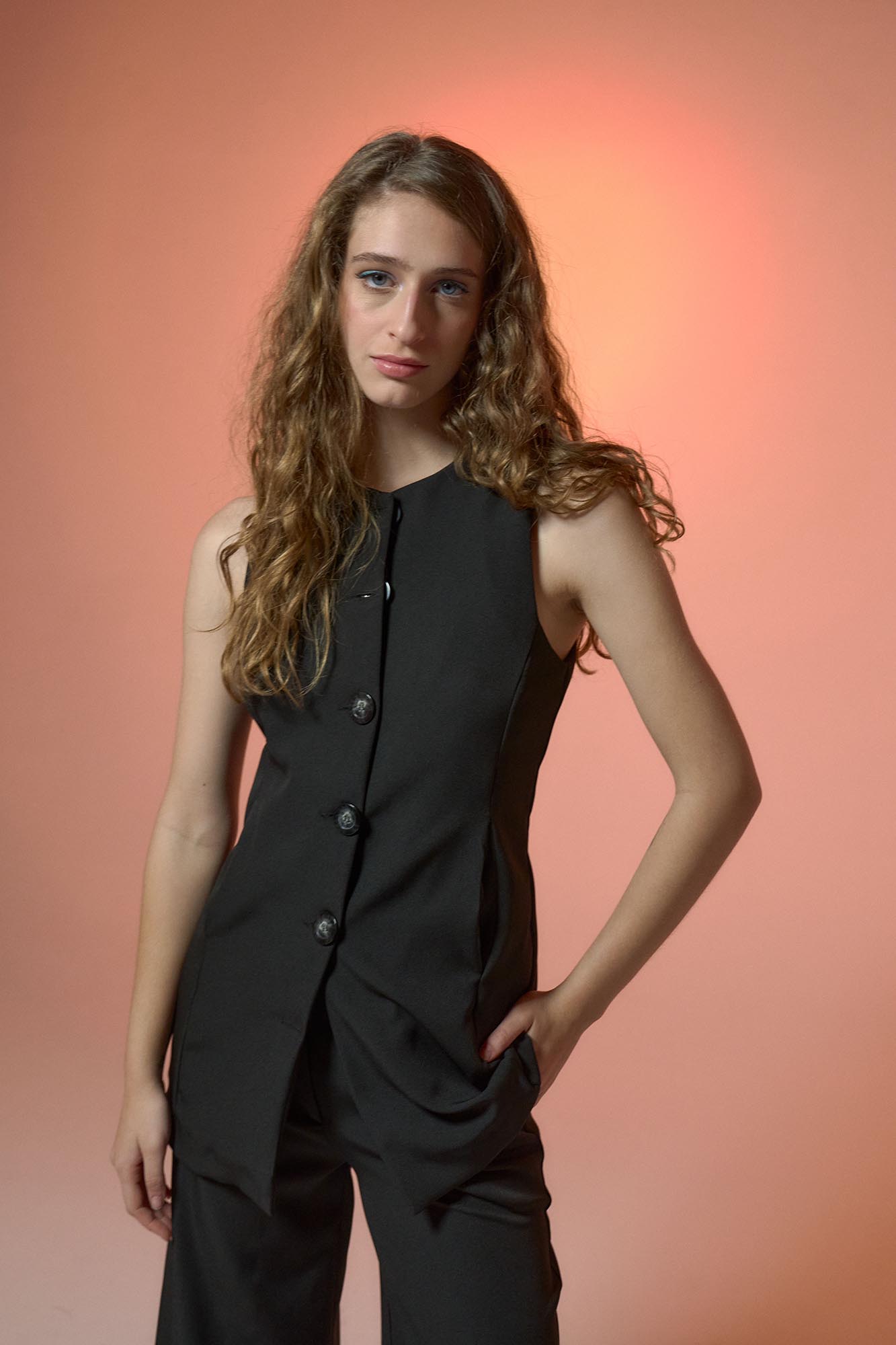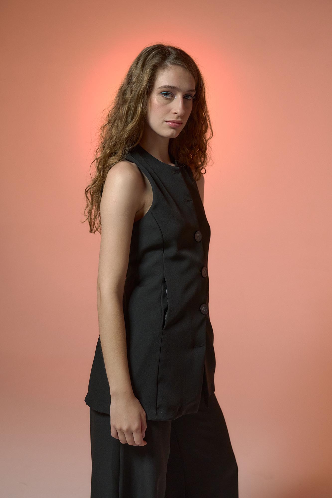 Chaleco largo corte sastrero. Botones de pasta y bolsillos Tiene tira para regular ancho en la espalda Material: Sastrero