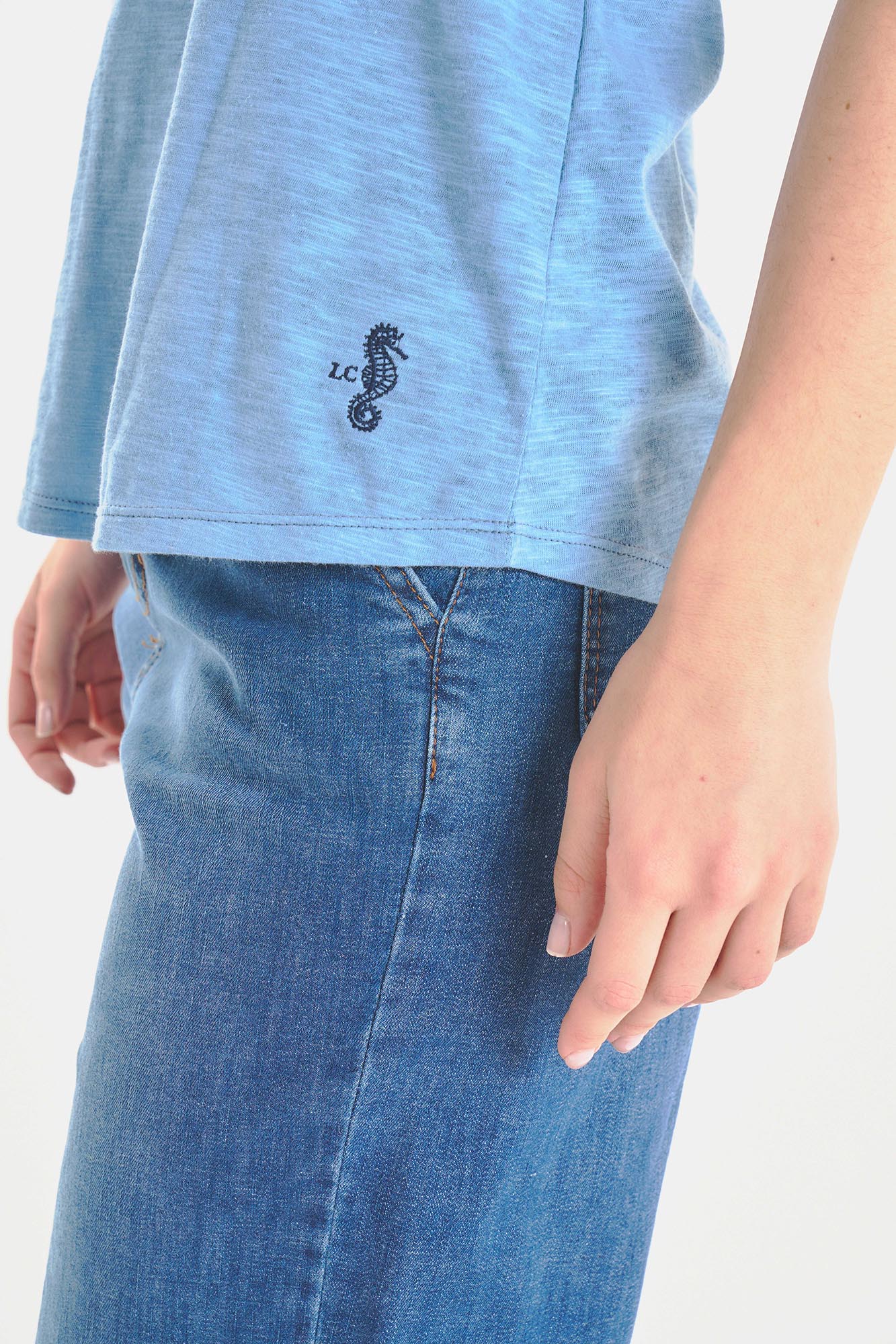 Musculosa cuello U, bajo redondeado. Calce relajado Bordado LC Hipocampo en el bajo Material: Flamé 100% ALGODÓN