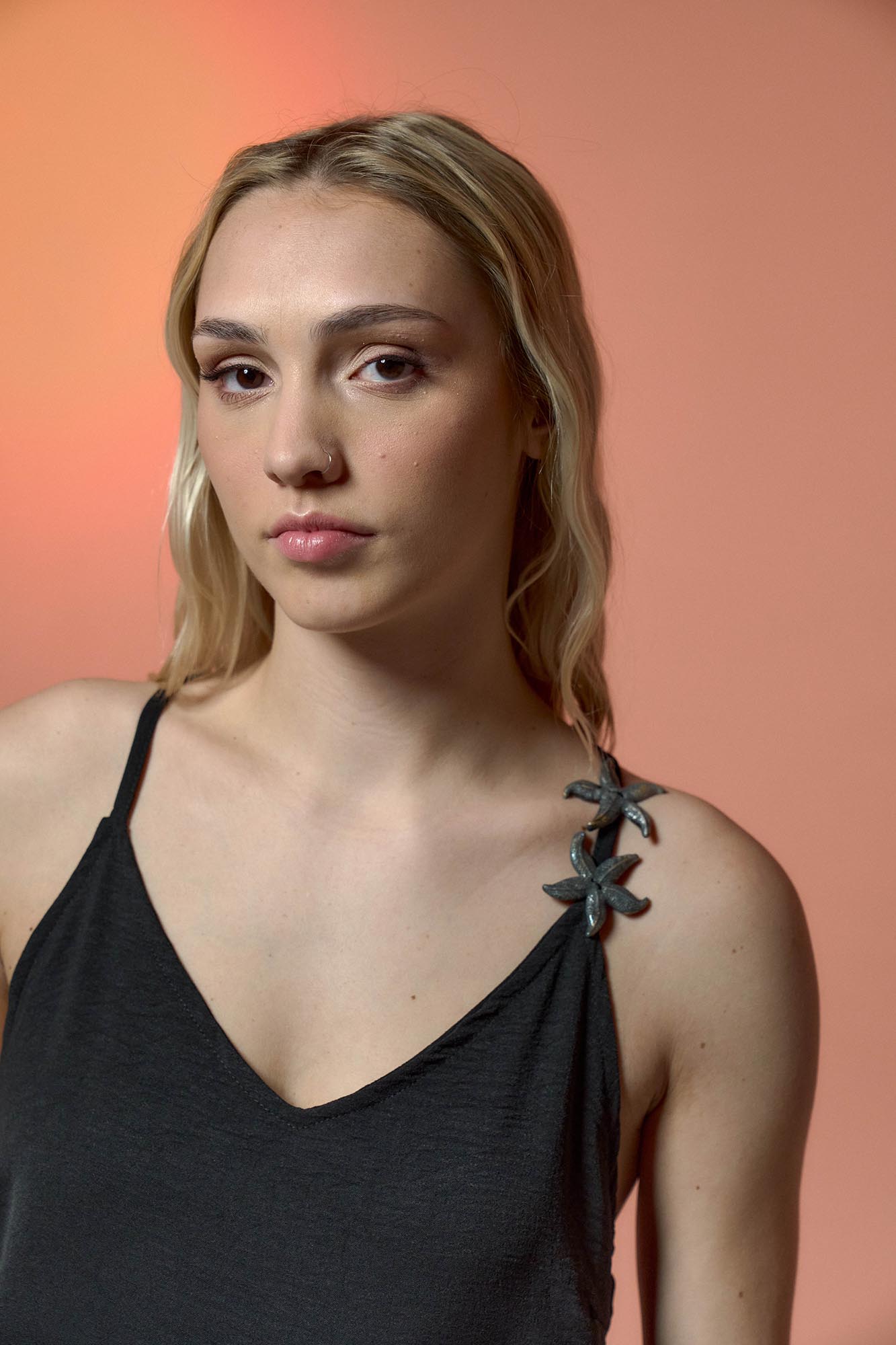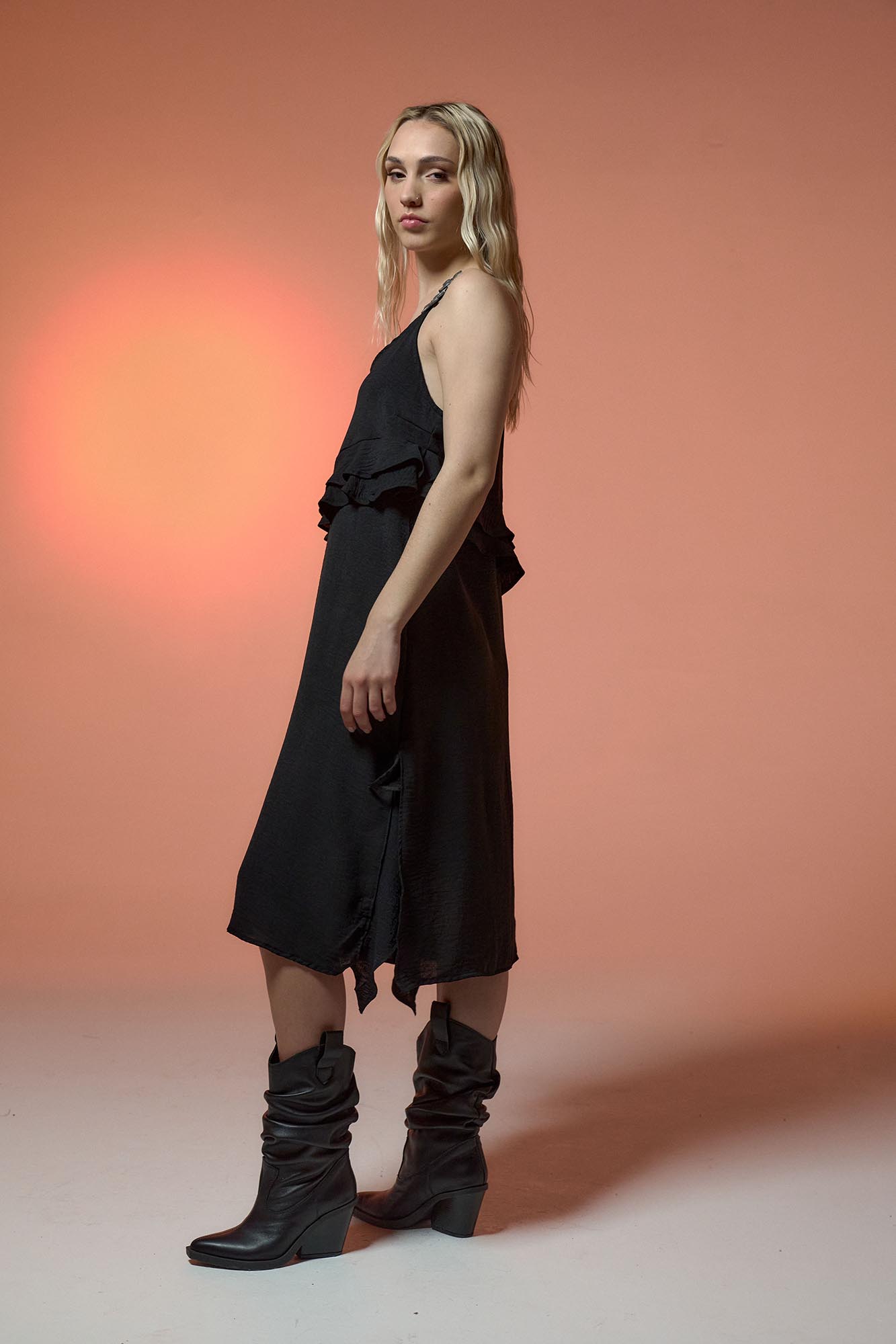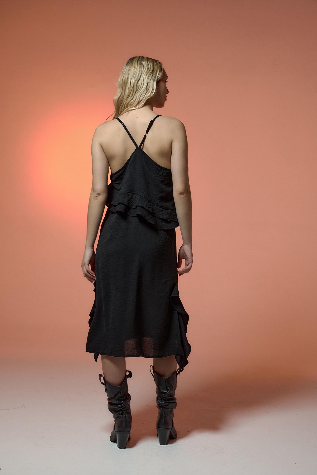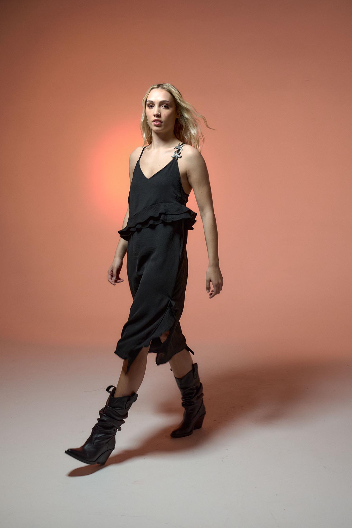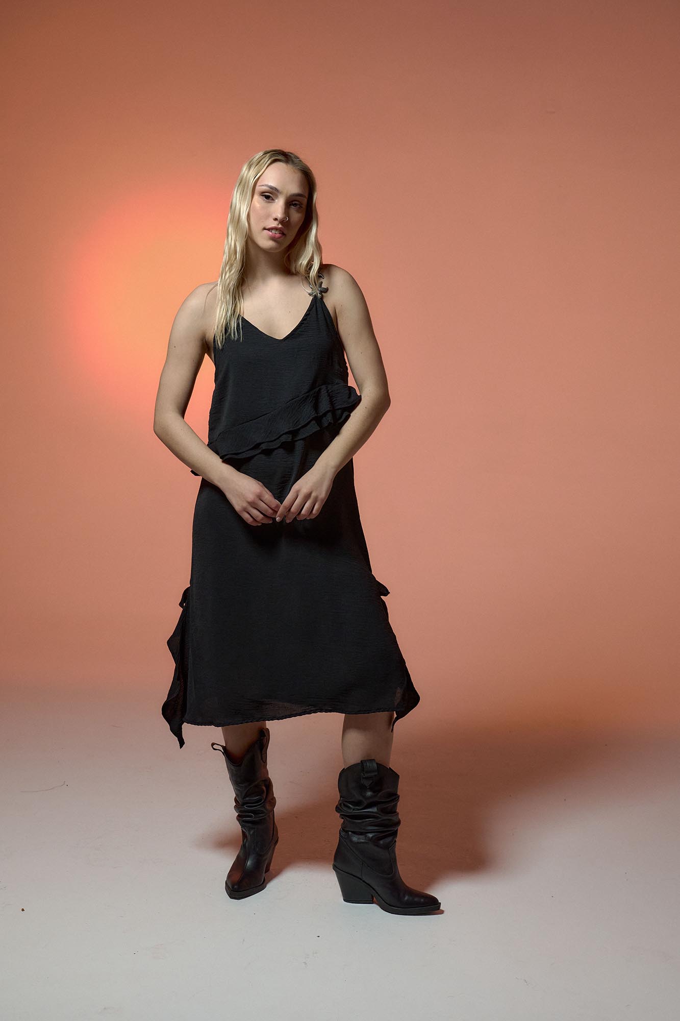 Vestido Midi con breteles regulables. Volados irregulares en frente y tajos Calce relajado Tiene Estrellas de mar LC de resina artesanales en bretel Material: Sedita efecto arrugado