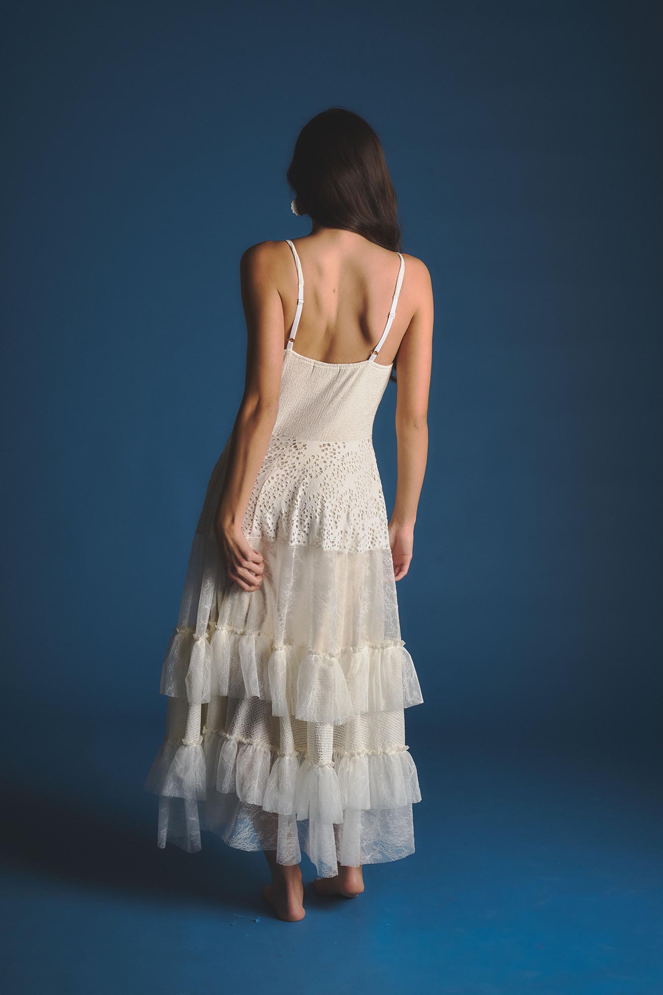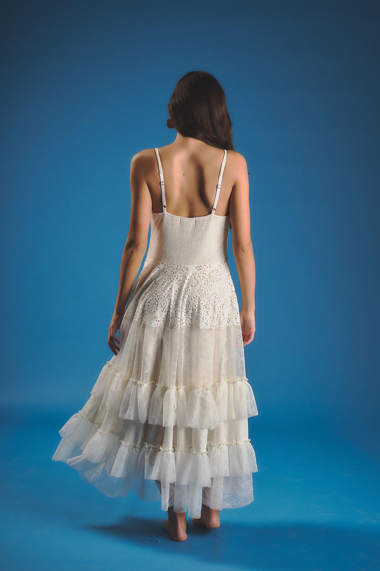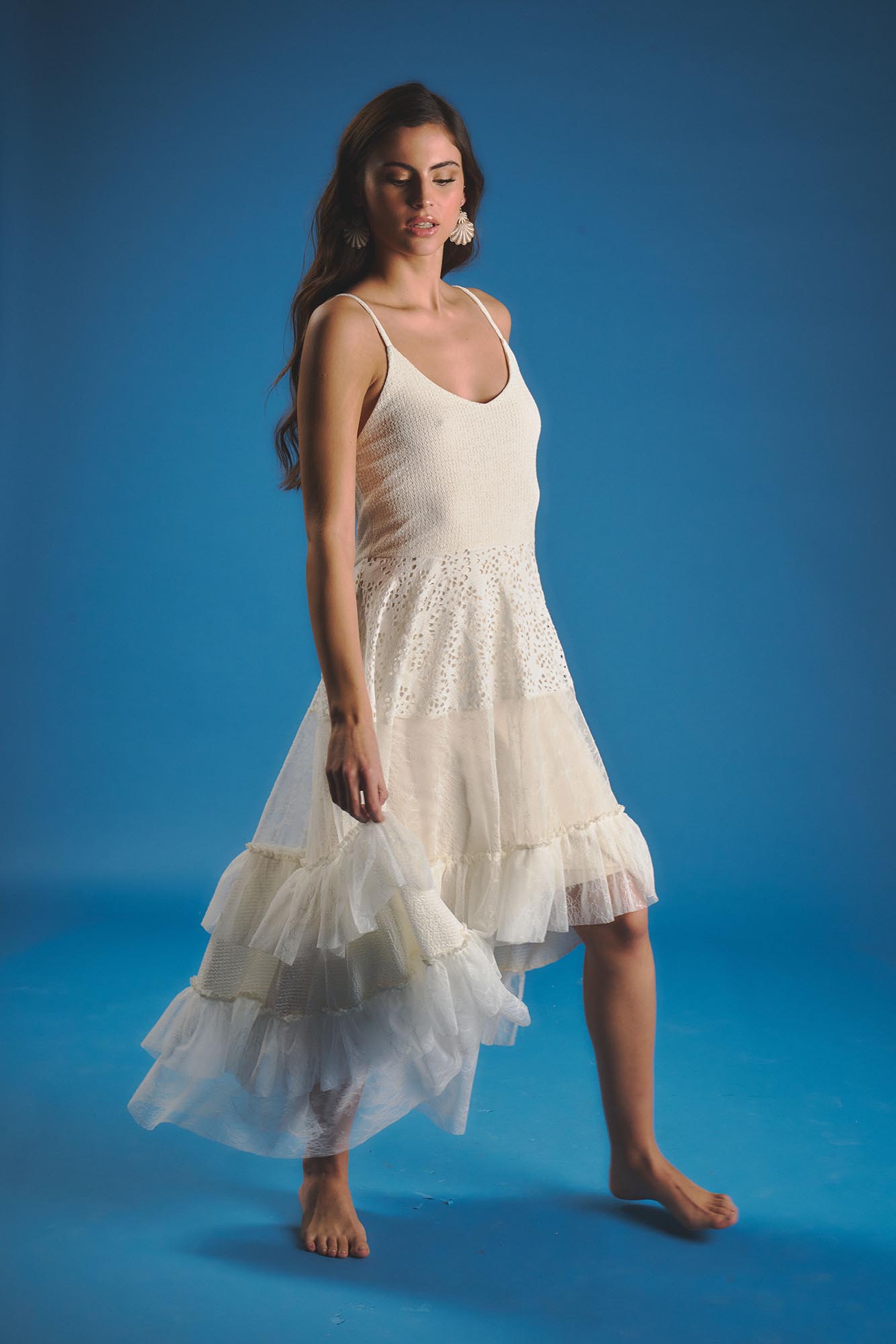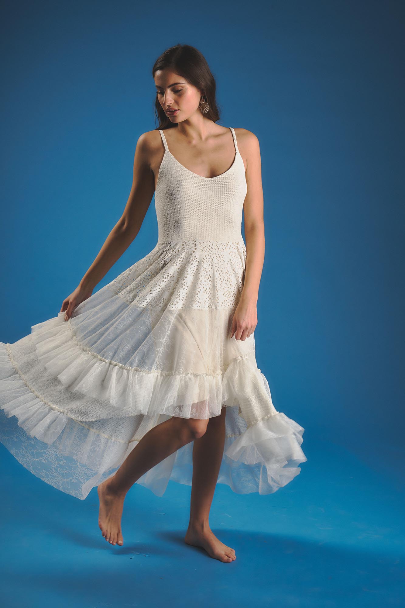 Vestido con partre superior al cuerpo y breteles finos. Falda irregular con distintas texturas Material: Tejido de punto fantasia en parte superior. Falda forrada en microfibra que combina trexturas de tul y encaje.