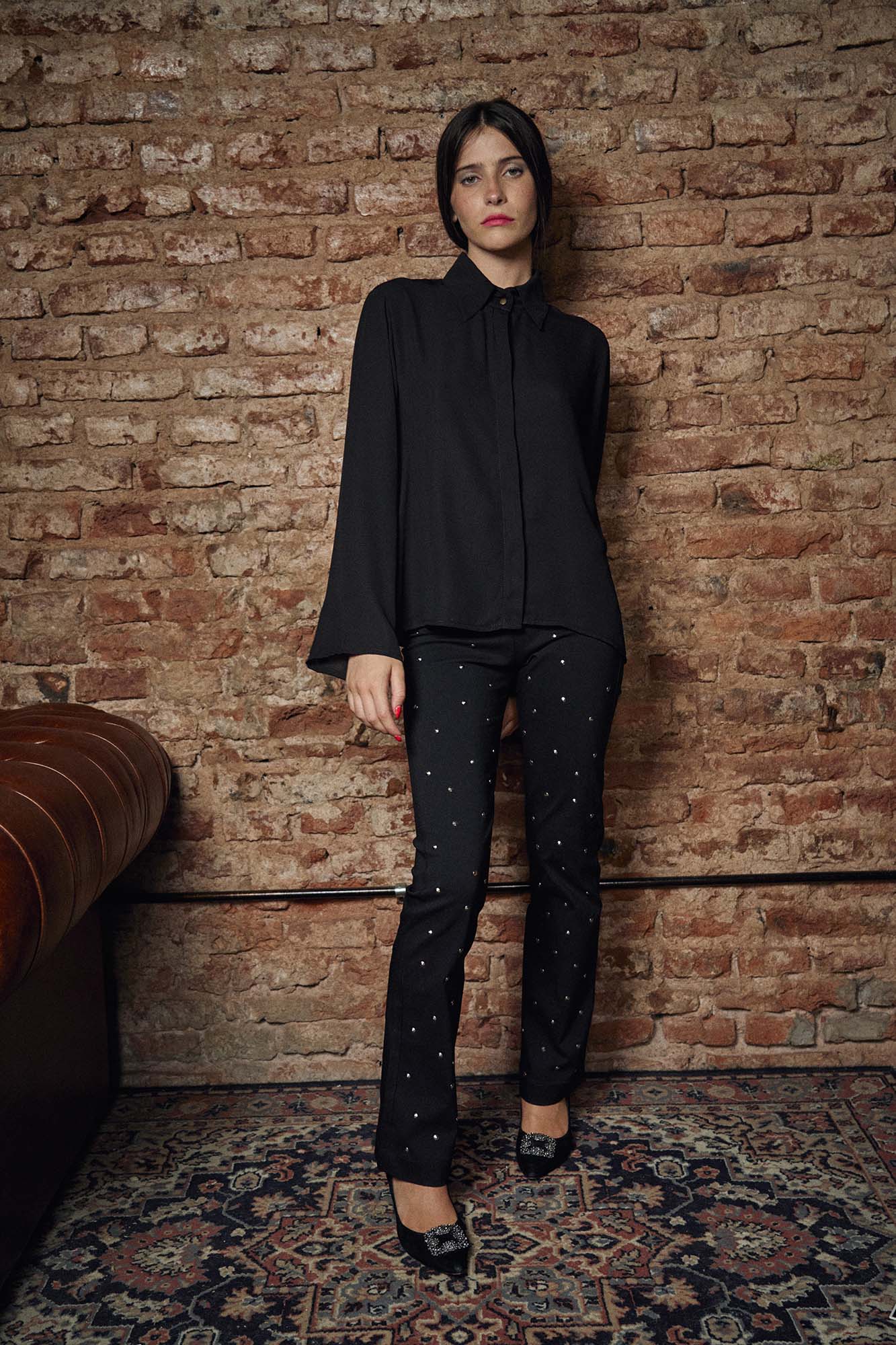 Camisa con botones de metal y mangas amplias de seda de poliester