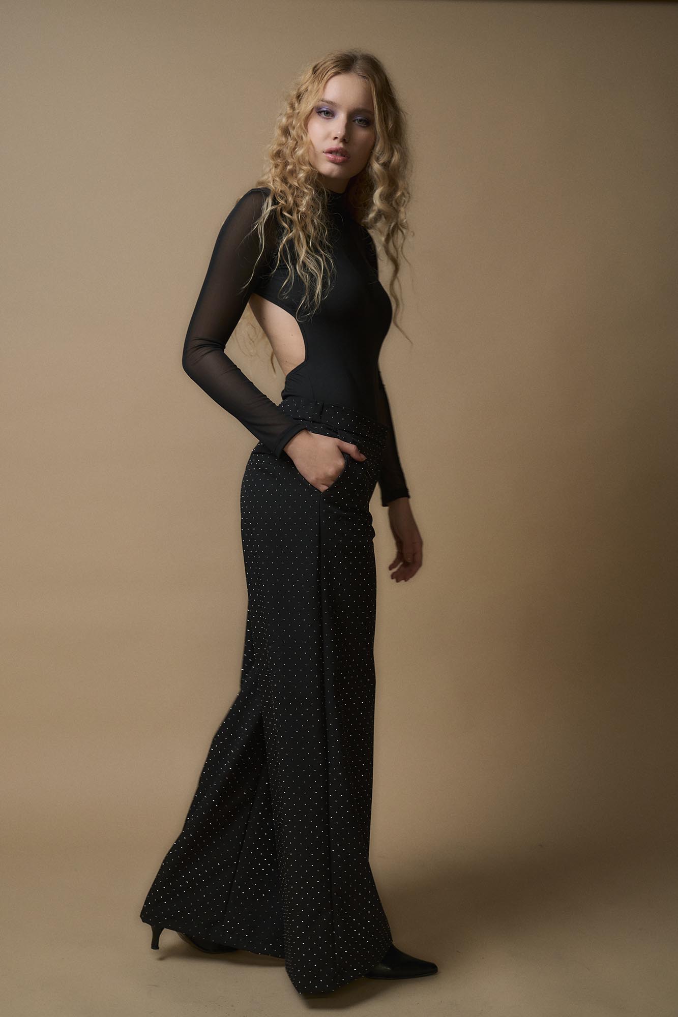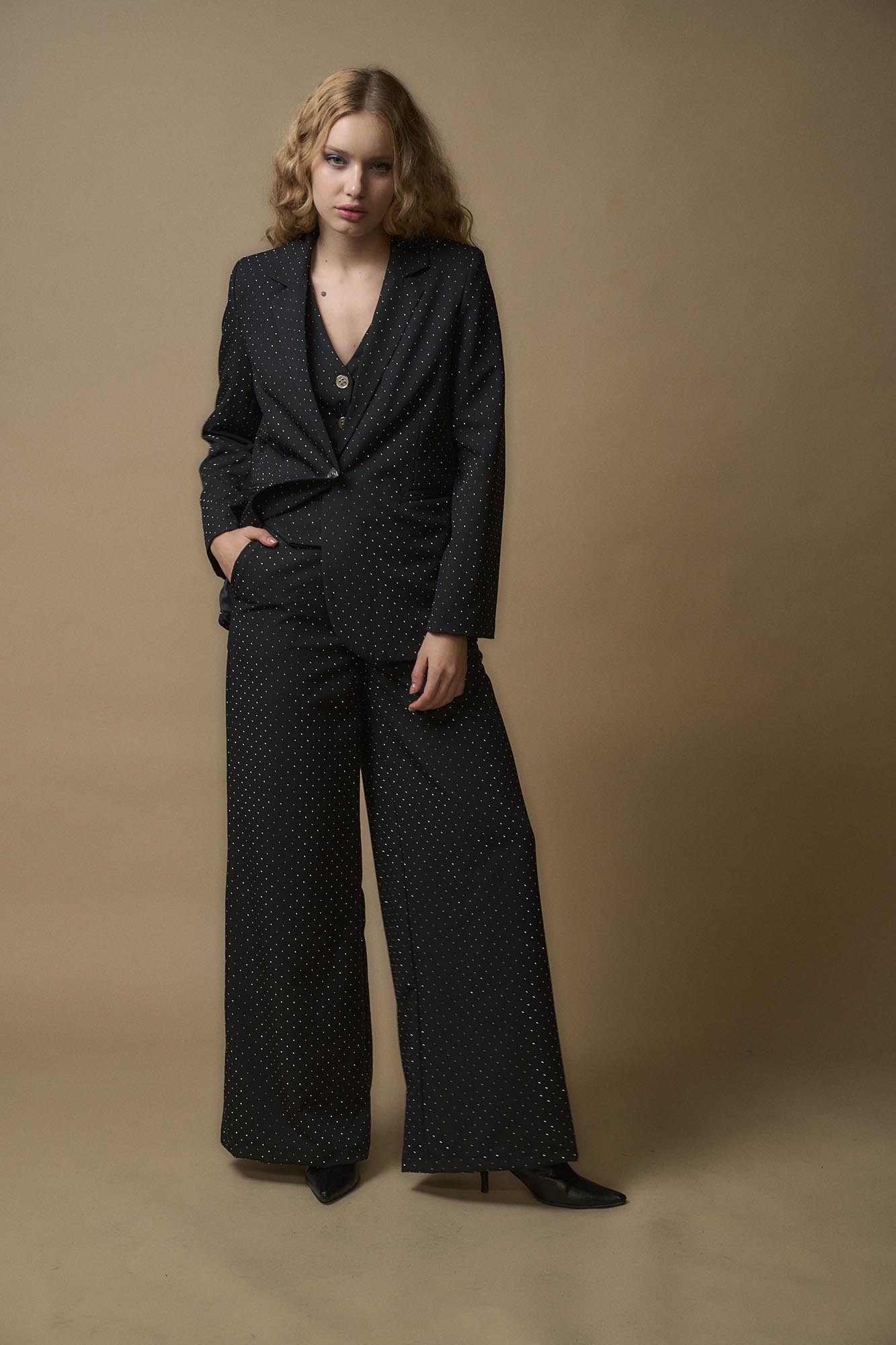 Pantalón sastrero con elastico en espalda. La tela es un sastrero y tiene aplicaciones de strass. Se puede usar en traje con el Chaleco y el Saco Lujuria.
