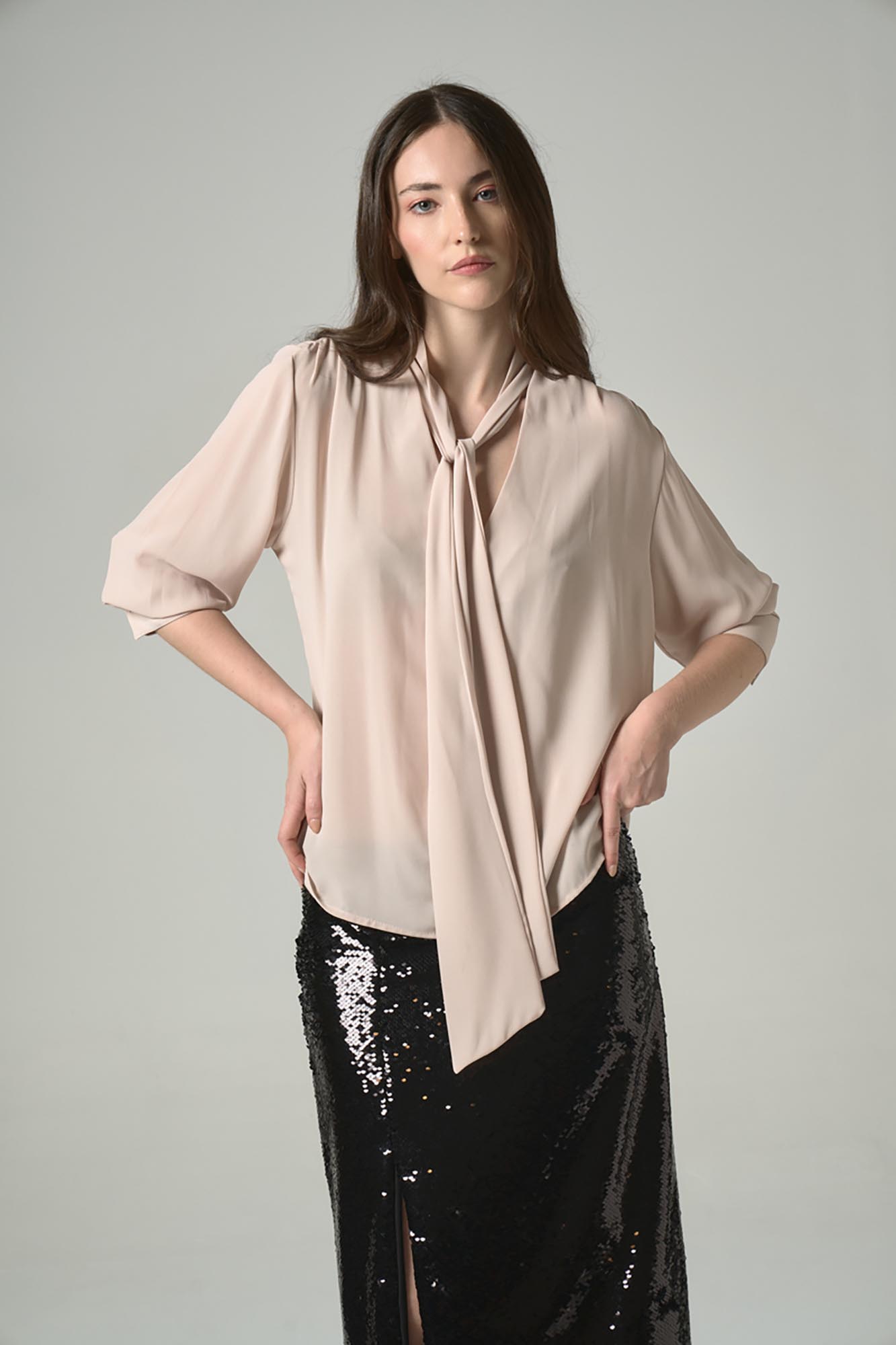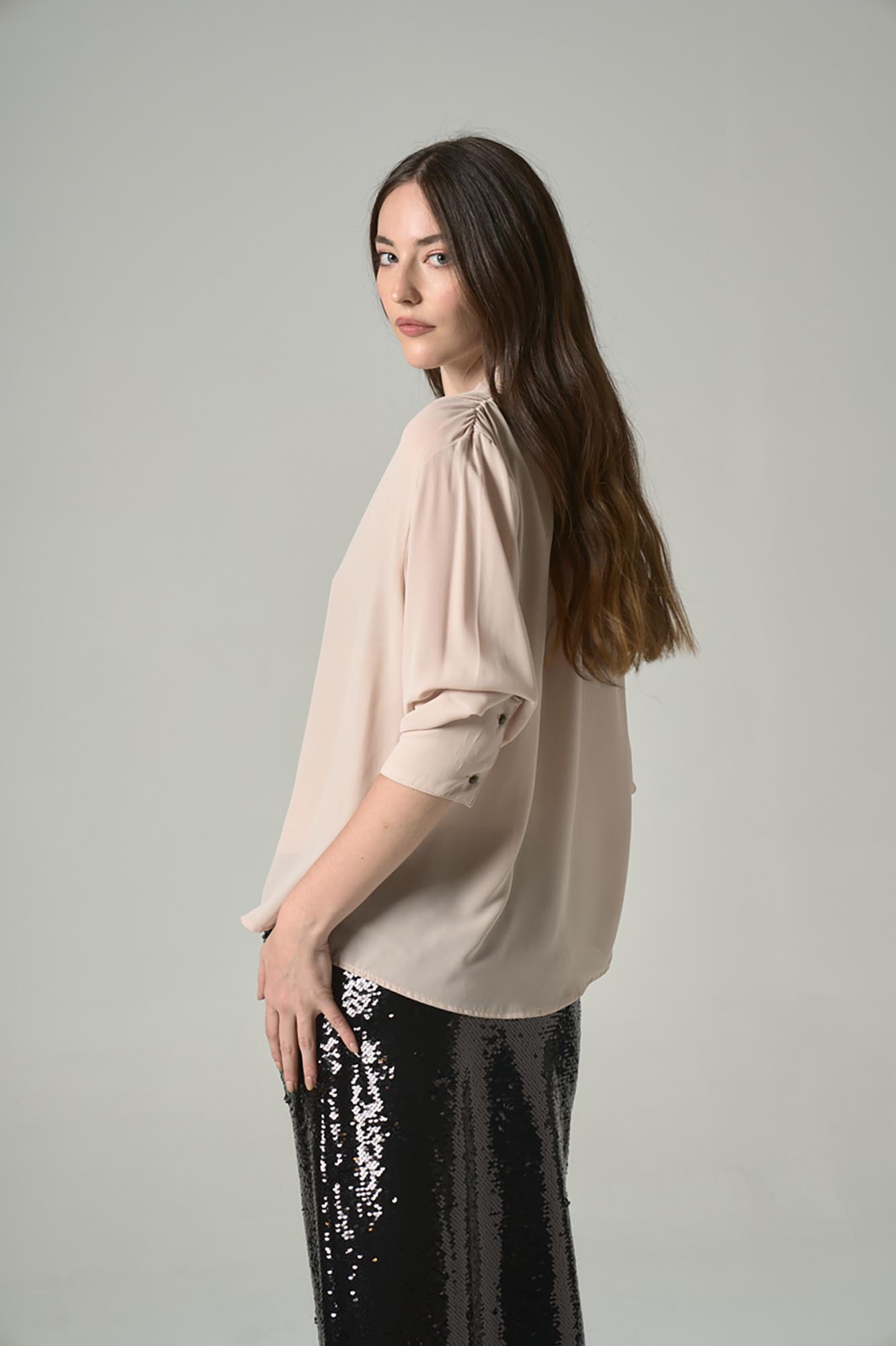 Blusa amplia, cuello V con lazo. Tiene frunces en hombros y puños con botones mini bolita color bronce