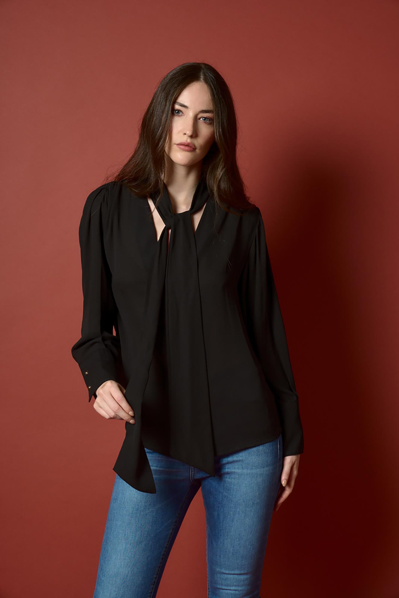 Blusa amplia, cuello V con lazo. Tiene frunces en hombros y puños con botones mini bolita color bronce