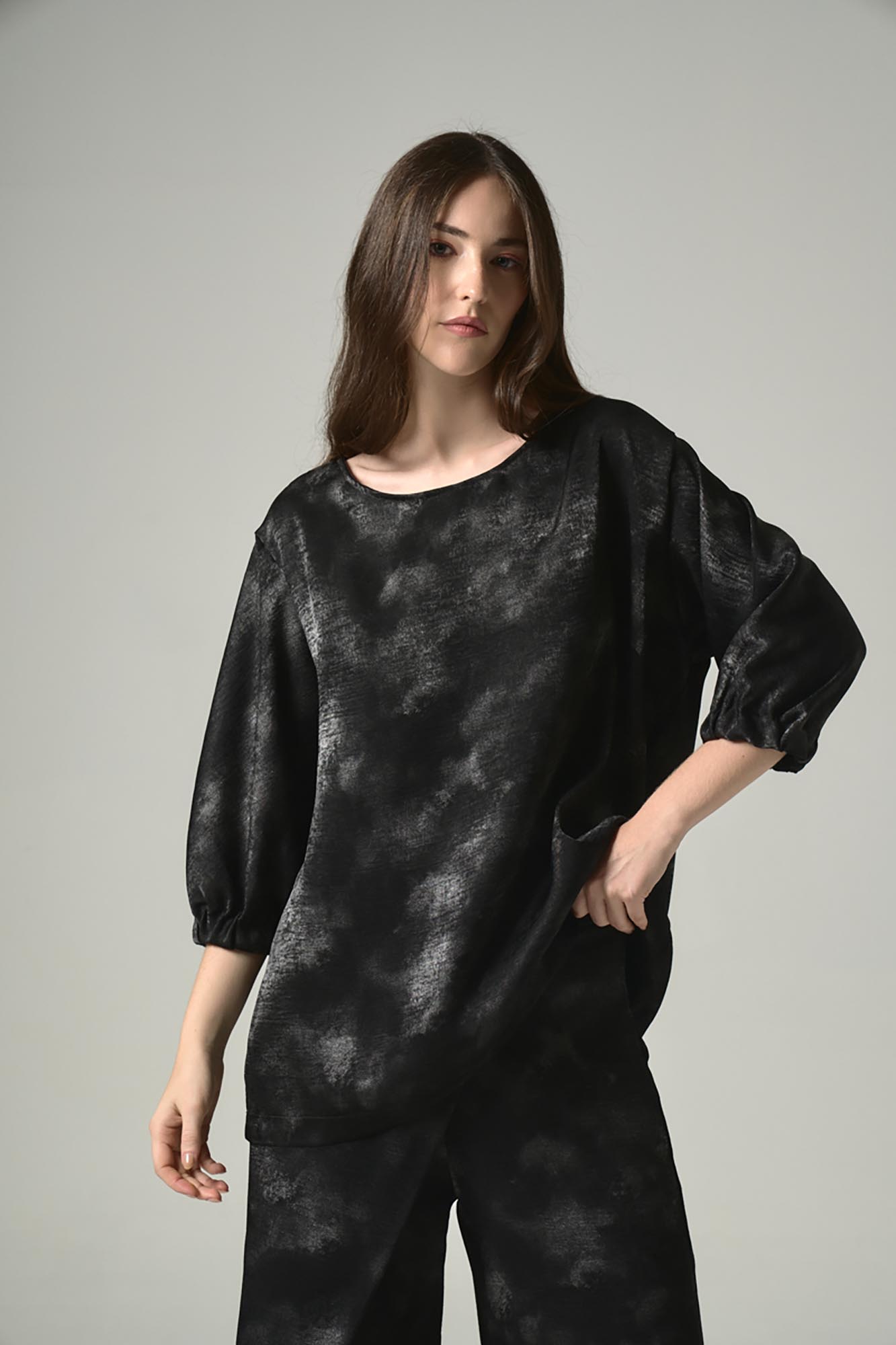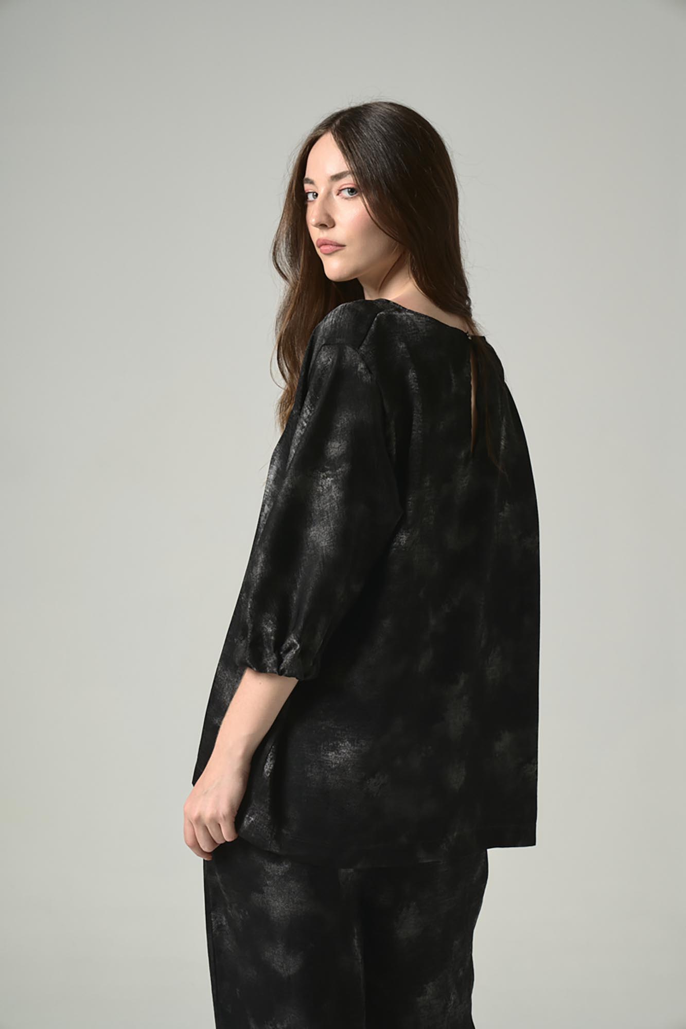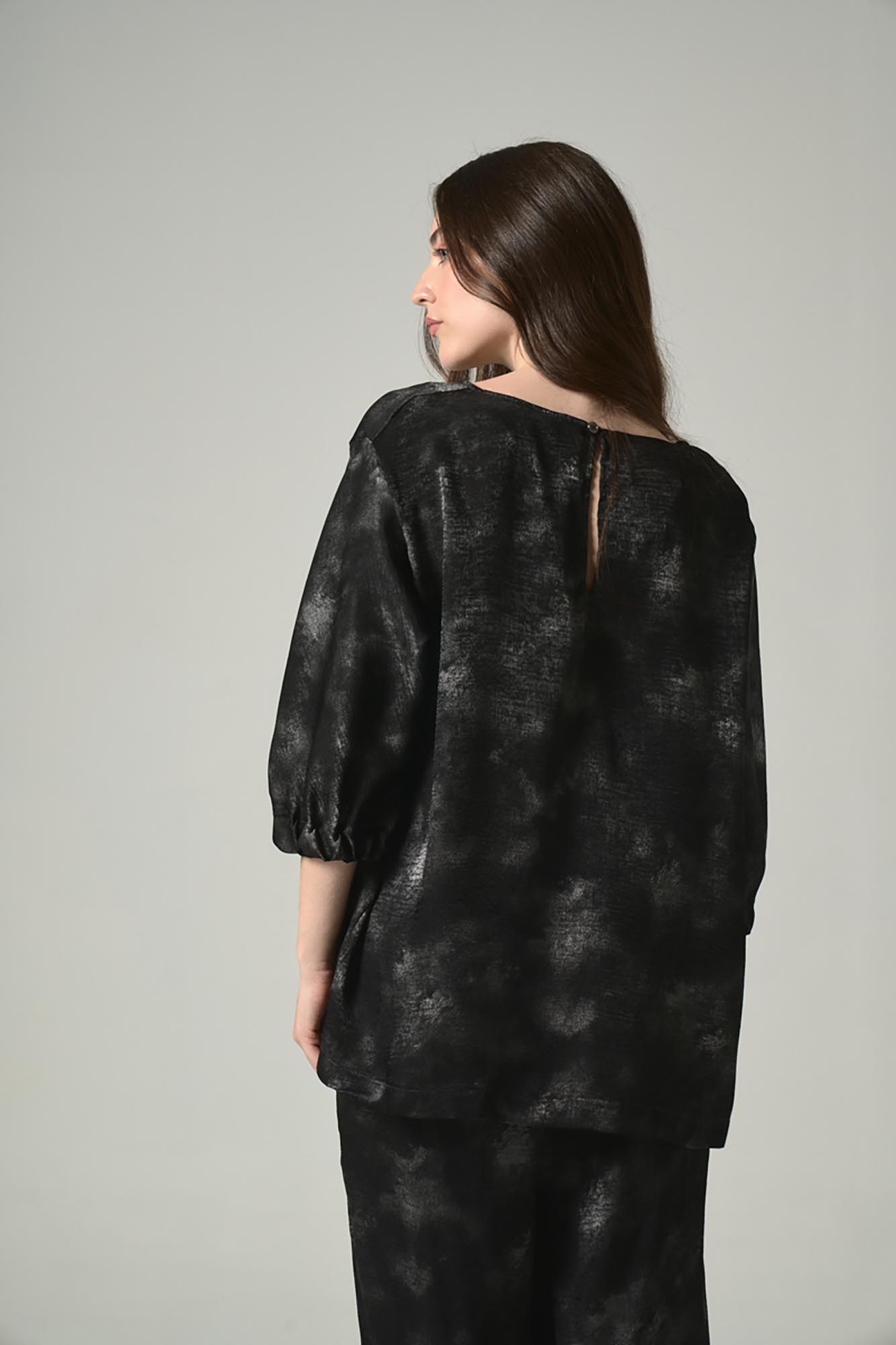 Blusa c/r con mangas al codo con elástico. Tiene gota en la espalda con botón de pie LC