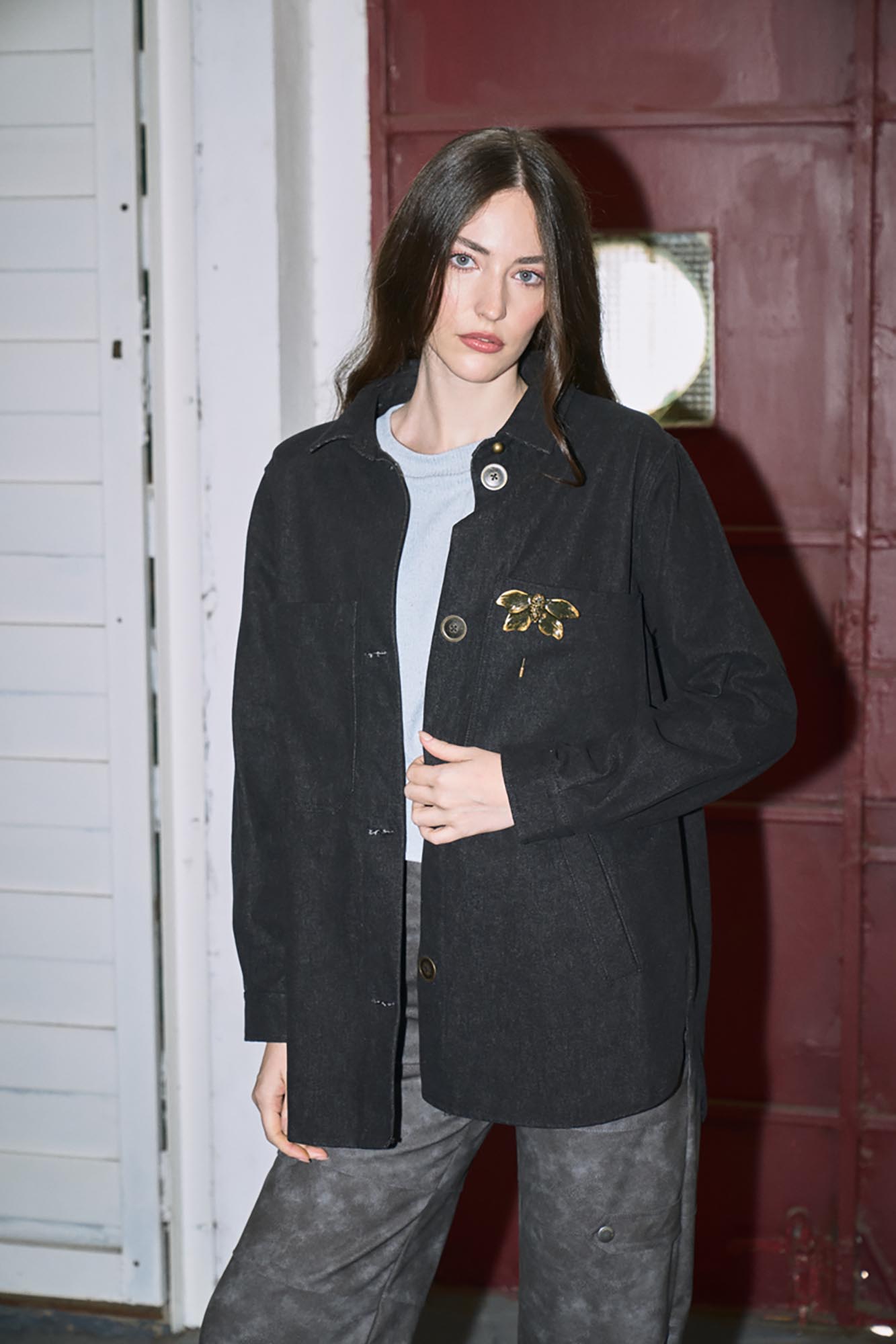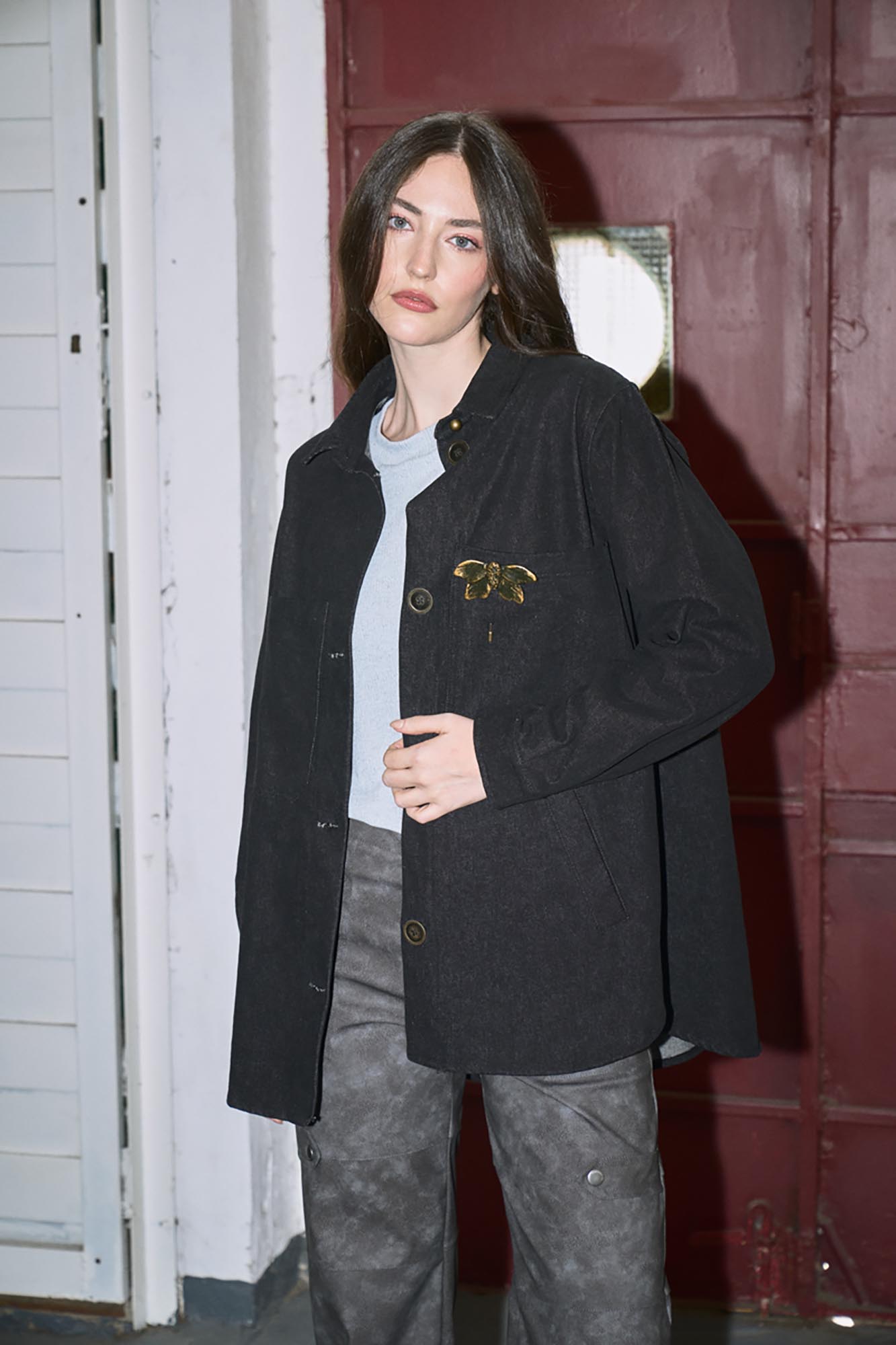 Camisaco de jean con botones de metal. Tiene alfiler artesanal polilla