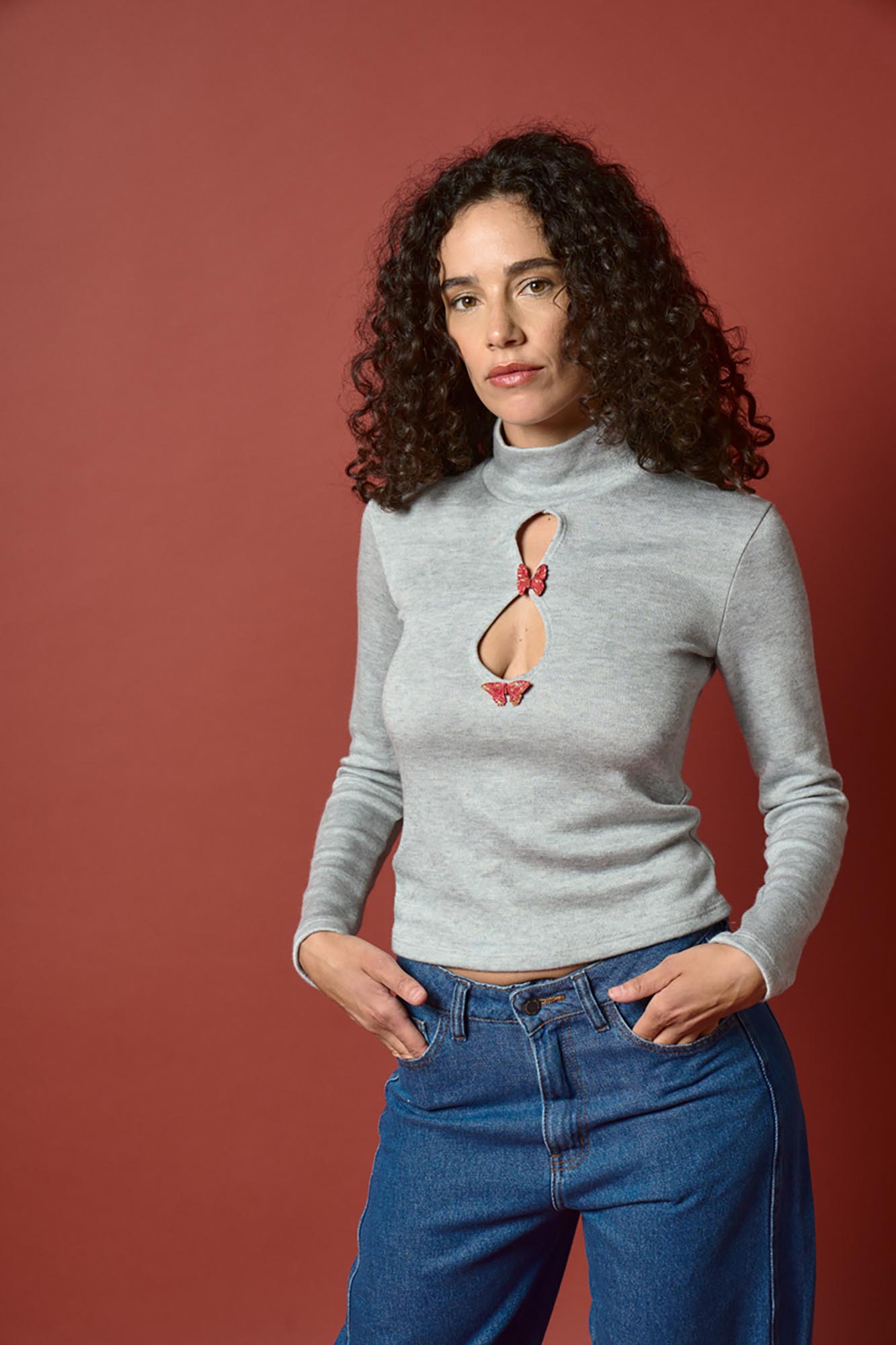 Media Polera con gota en el frente con pins de resina mariposa