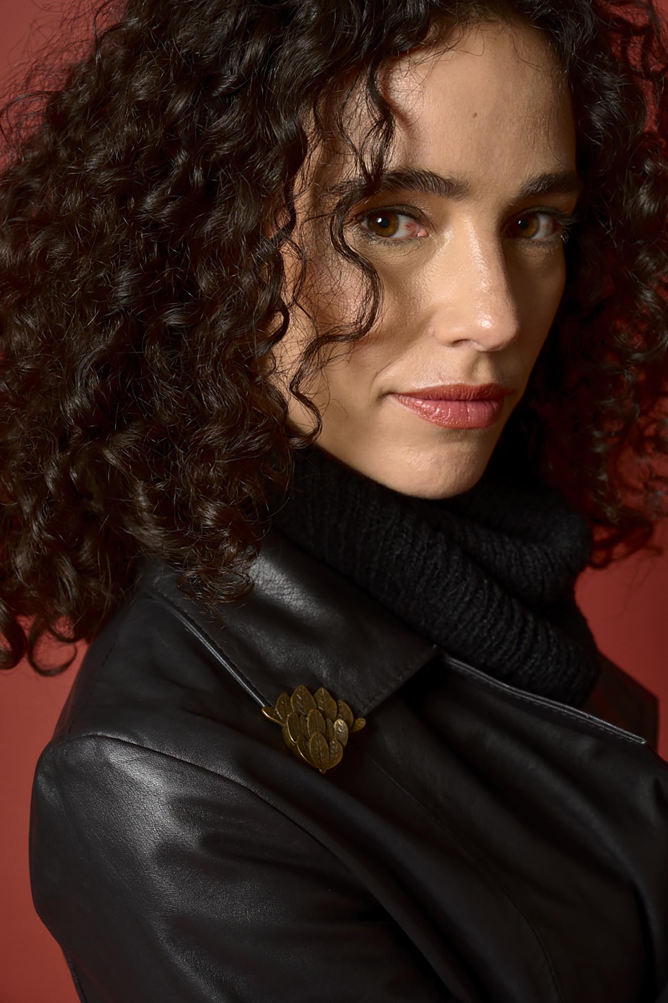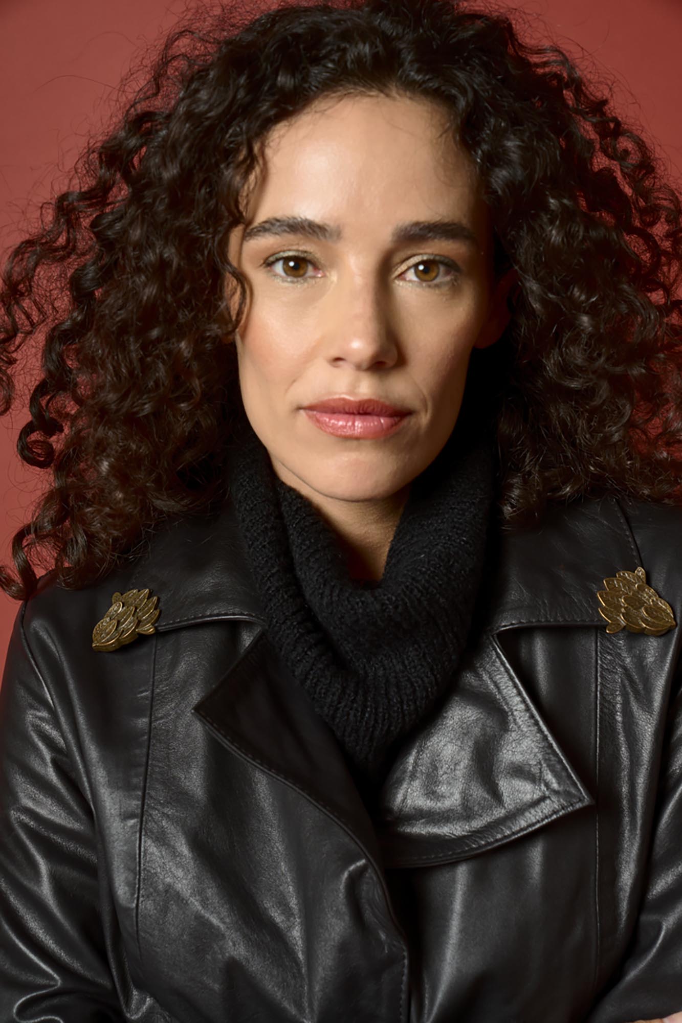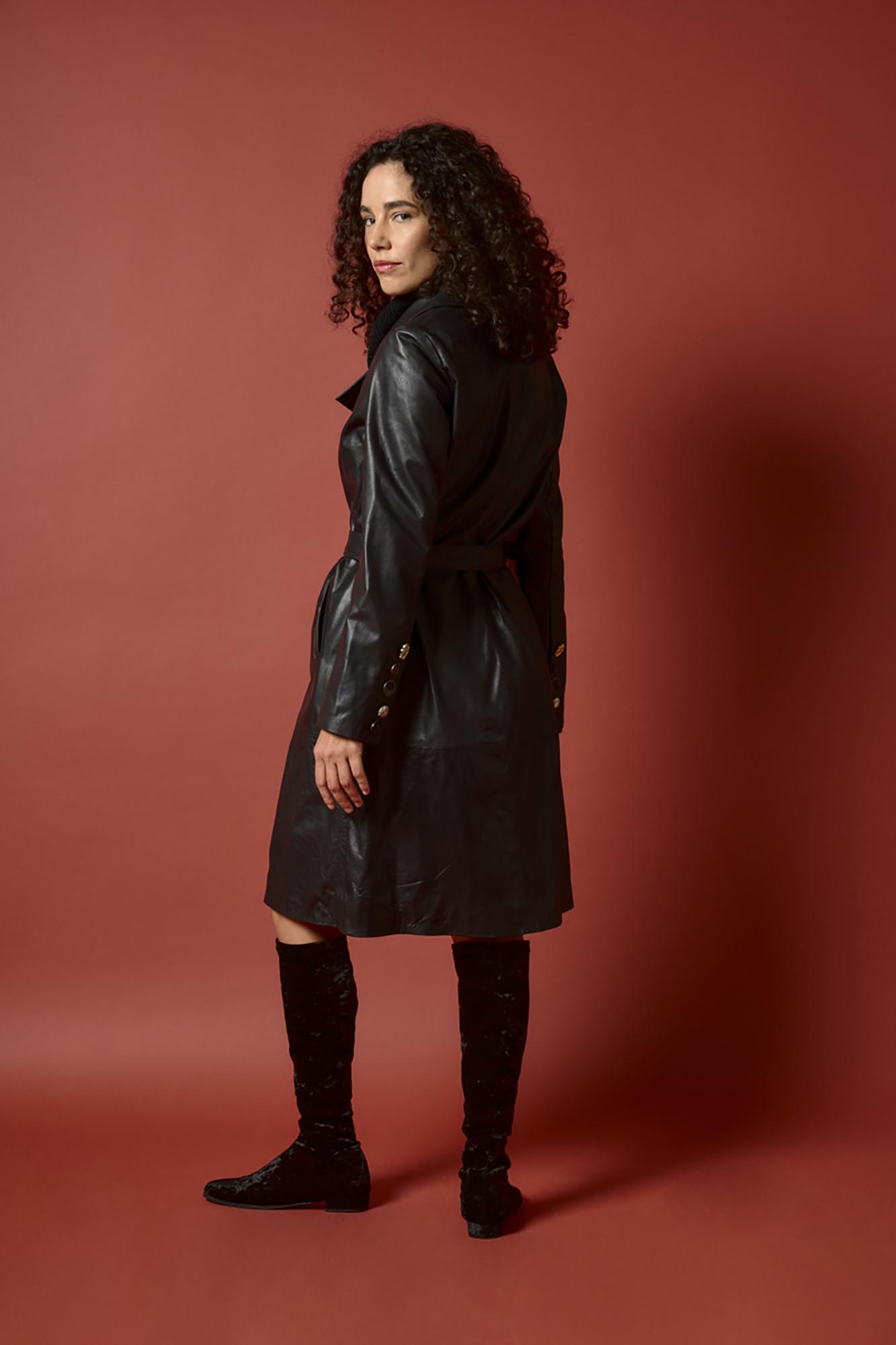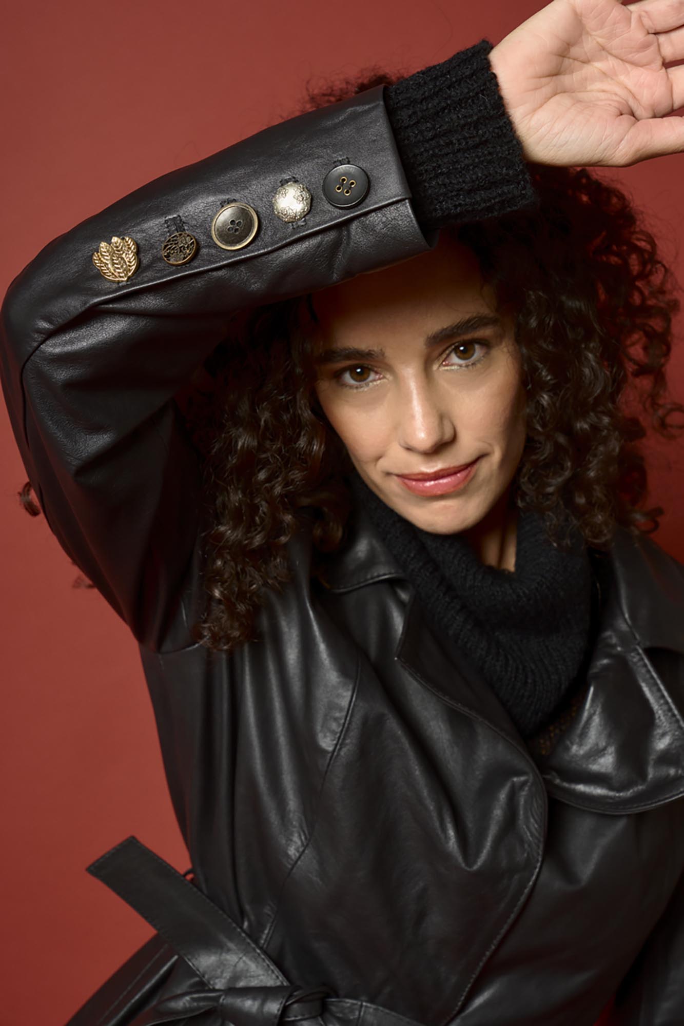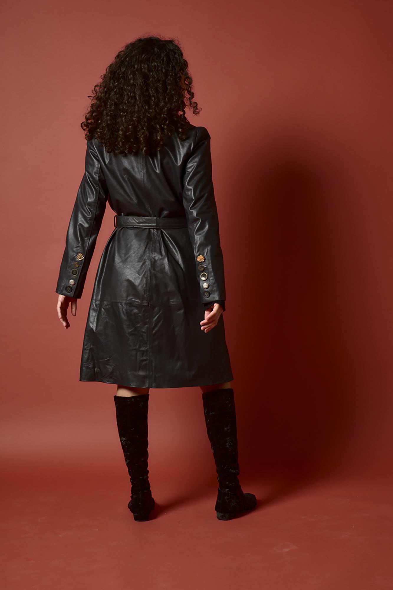 Tapado recto con lazo. Tiene punteras en el cuello color bronce y botones artesanales de distintas formas en puños
